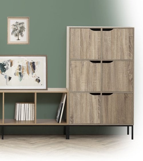La estantería Mix N'modul de 6 módulos con puertas es perfecta para organizar tus objetos. Cada compartimiento tiene una puerta abatible que permite un fácil acceso a tus pertenencias. Su color roble natural aporta elegancia y calidez a cualquier ambiente. Con medidas de 67,5 x 32 x 100,5 cm, se adapta a cualquier rincón de tu hogar.