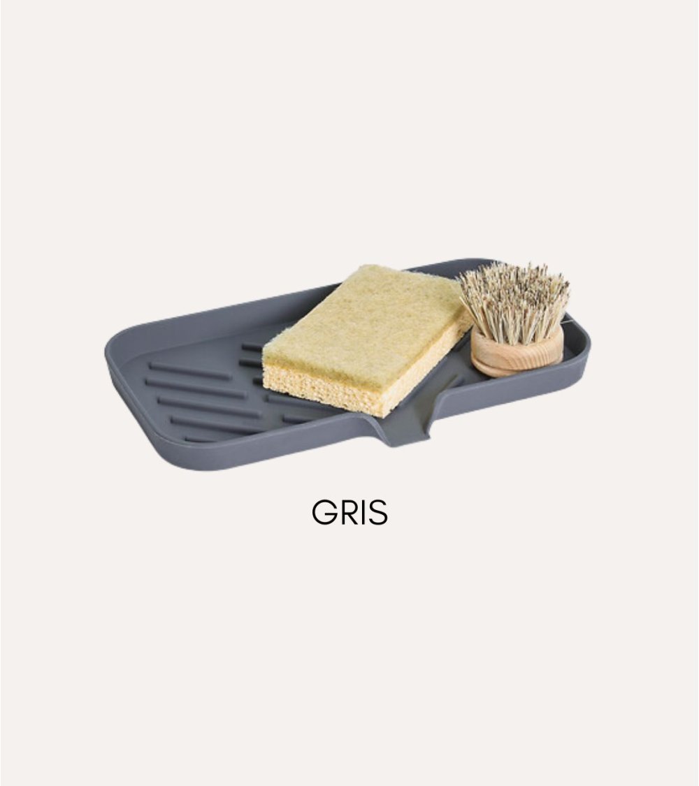 La bandeja para esponja protector de fregadero Siléo está fabricada en plástico resistente, ideal para colocar esponjas, estropajos o pequeños utensilios de cocina. Su superficie con ranuras diagonales facilita el drenaje del agua, evitando acumulaciones y la proliferación de bacterias. Disponible en beige, verde suave y gris oscuro, se adapta a cualquier estilo decorativo. Sus bordes elevados con ondas suaves evitan la caída accidental de objetos. Dimensiones: 24,1 x 14,6 x 1,7 cm. Material resistente y fácil de limpiar.