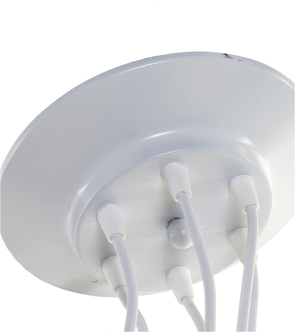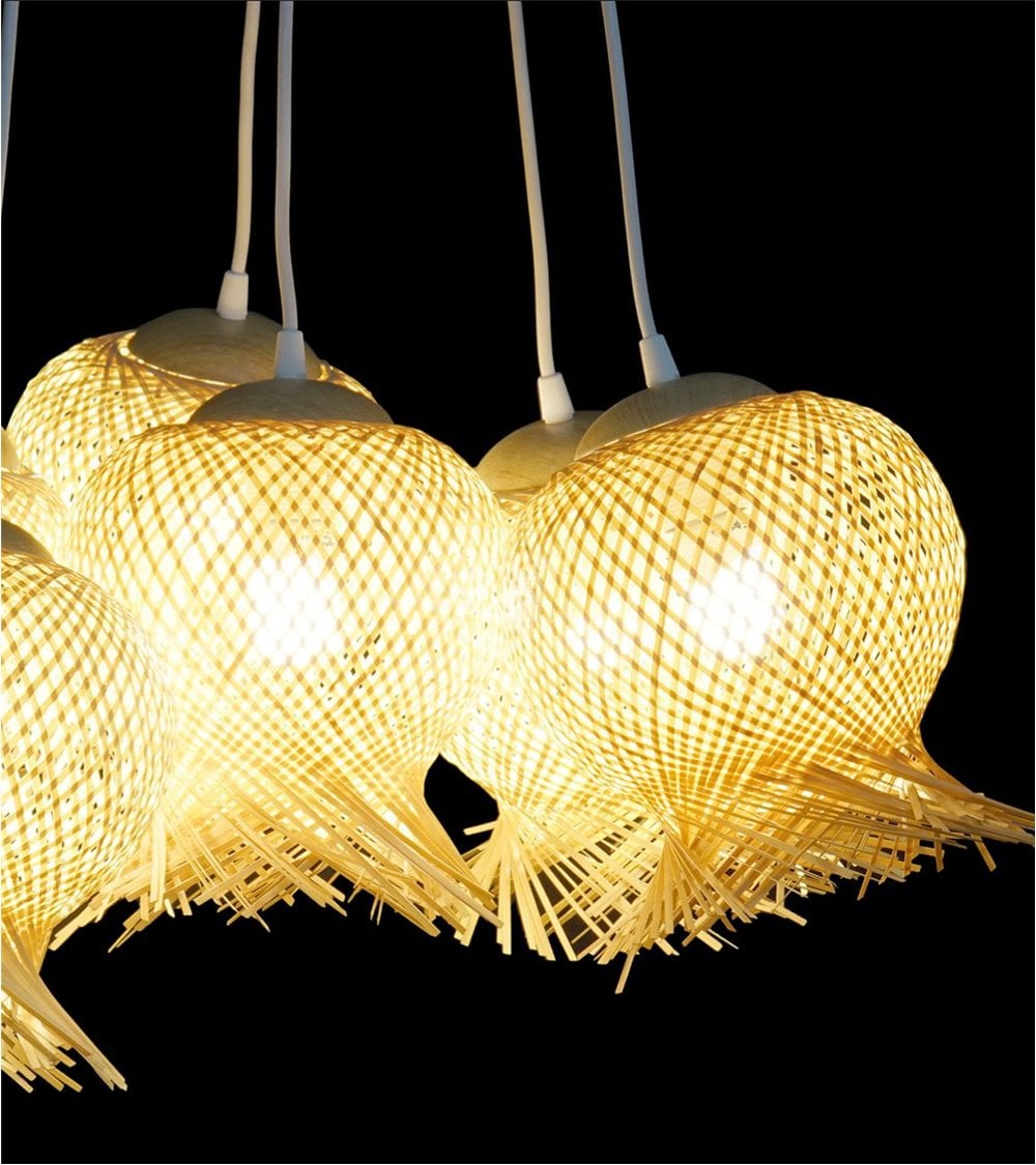 Está lámpara de techo cuenta con seis pantallas colgantes elaboradas en bambú de color natural. Además, cuenta con seis casquillos para bombilla E27 y varios cables blancos que soportan las pantallas, pudiendo regularlos en la medida que prefieras.