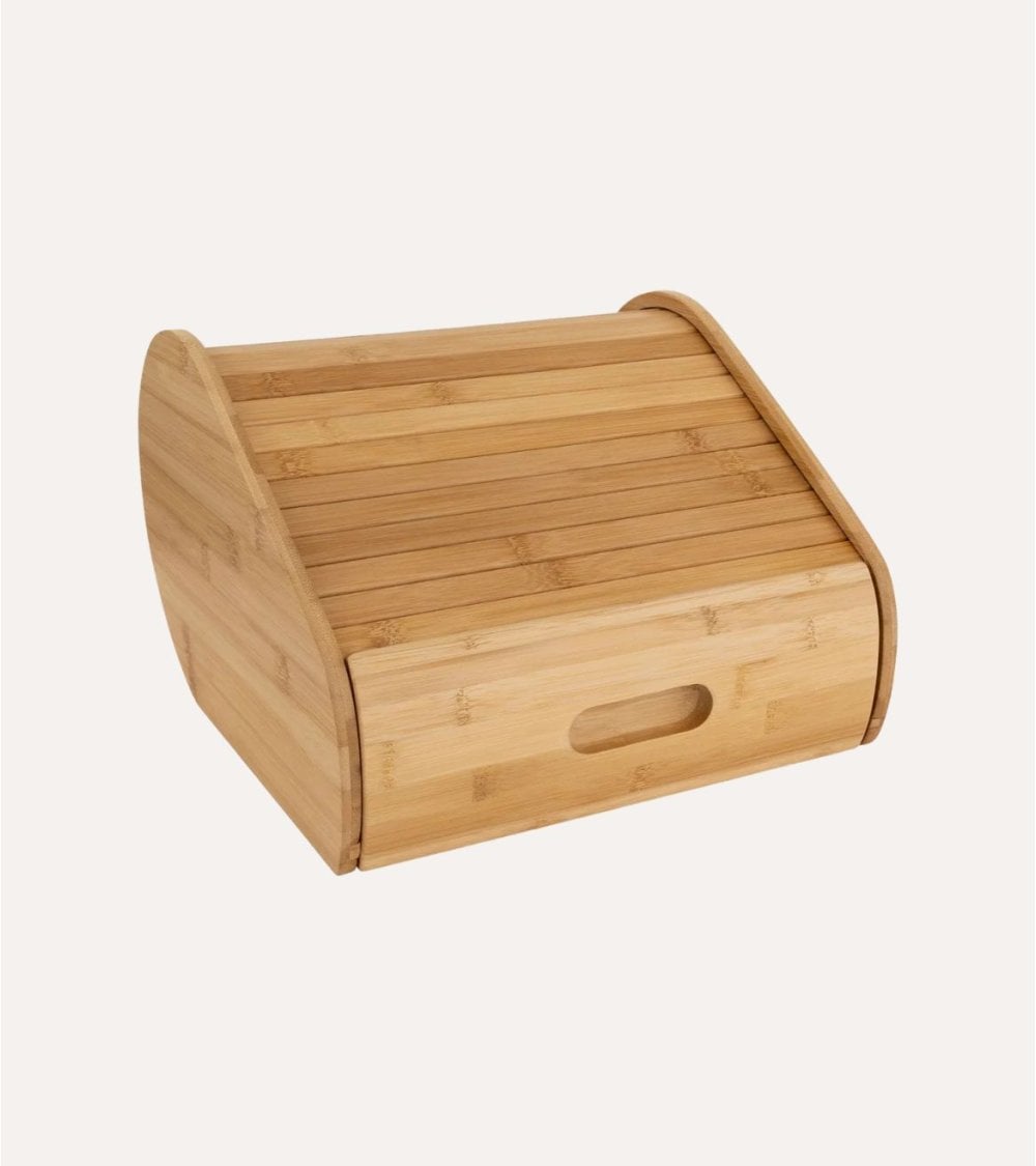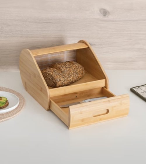 El cajón frontal con apertura sencilla mediante un corte ergonómico ofrece acceso rápido a tus alimentos, evitando la necesidad de asas voluminosas que puedan romper la estética minimalista. La tapa superior curvada con listones permite una ventilación adecuada, ayudando a conservar el aroma y textura original del pan al evitar la acumulación de humedad.