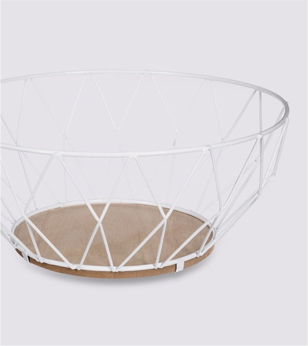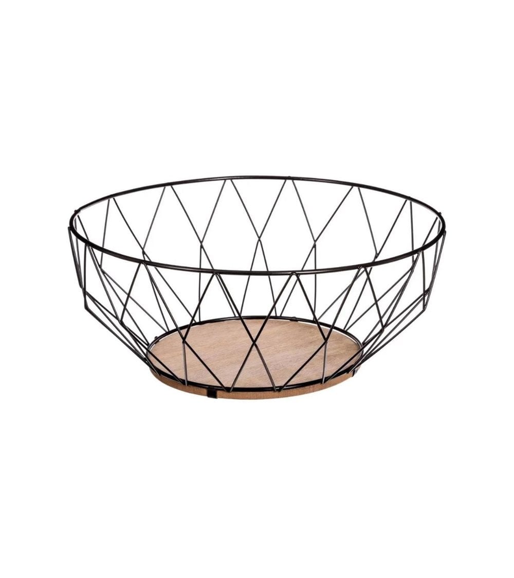 Cesta para frutas con estructura en forma de diamante fabricado en metal y base de madera. Disponible en diferentes colores.