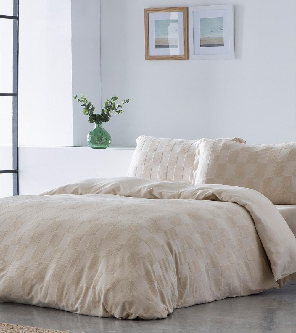 Funda nórdica reversible 100% algodón con delicado diseño de cuadros con textura. Incluye funda de almohada a juego.