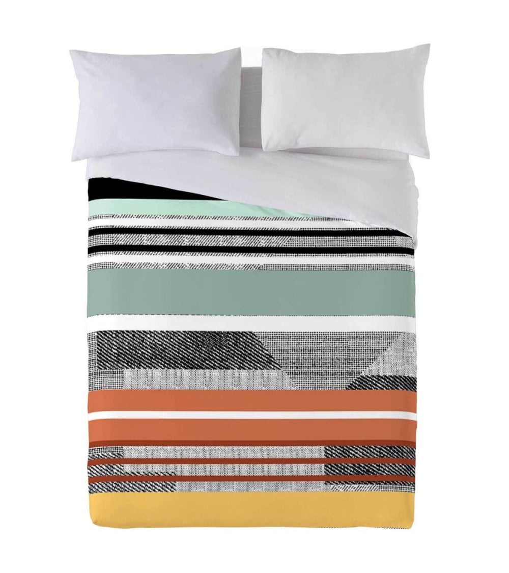 La Funda Nórdica Denim con Funda de Almohada es una opción ideal para tu cama. Con un cierre solapa, esta funda tiene una prolongación de unos 45 cm que puedes remeter hacia el interior o sujetar entre el somier y el colchón. Dependiendo del tamaño, incluye una o dos fundas de almohada. Fabricado con 100% algodón de 140 hilos, ofrece una textura extra suave. Su diseño presenta líneas horizontales de colores verde, naranja, negro y amarillo, aportando un toque de estilo a tu habitación.