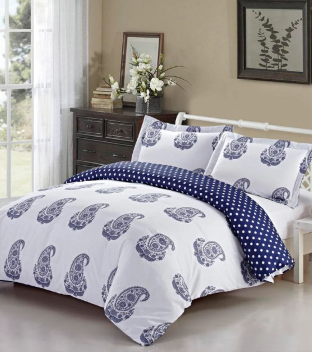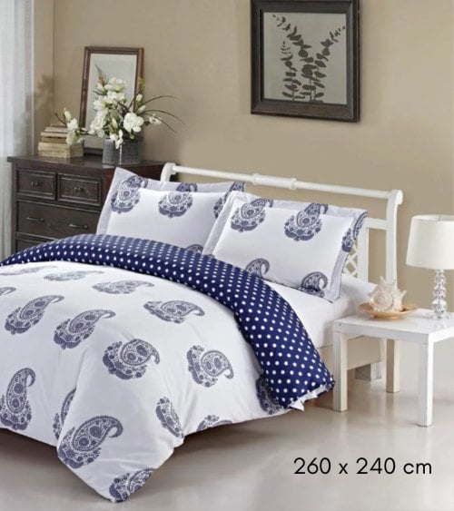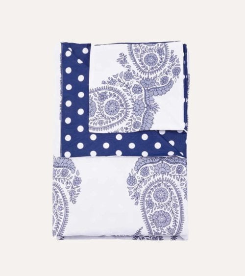 - Diseño: Patrón paisley en azul marino combinado con acentos de lunares blancos, ideal para cualquier estilo decorativo.