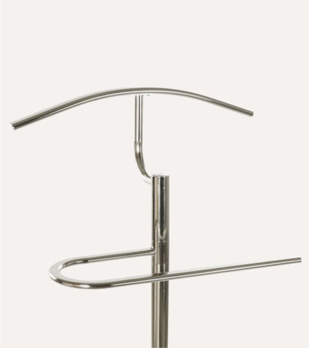 No solo es un accesorio práctico, sino también una pieza decorativa que complementa tu hogar. El Galán de Noche Plateado de Acero te permite preparar tus atuendos la noche anterior, facilitando tus mañanas y ayudándote a lucir siempre impecable.
