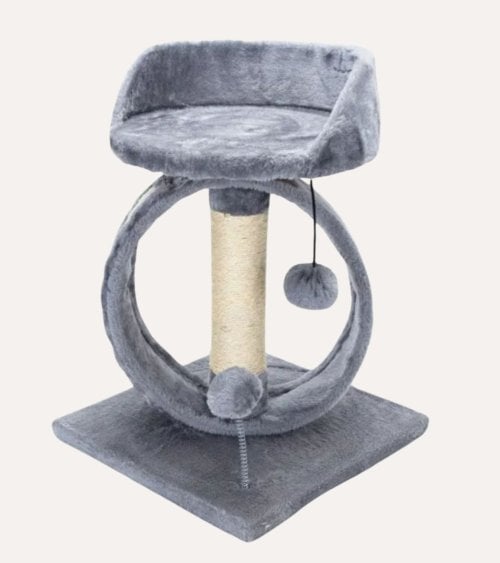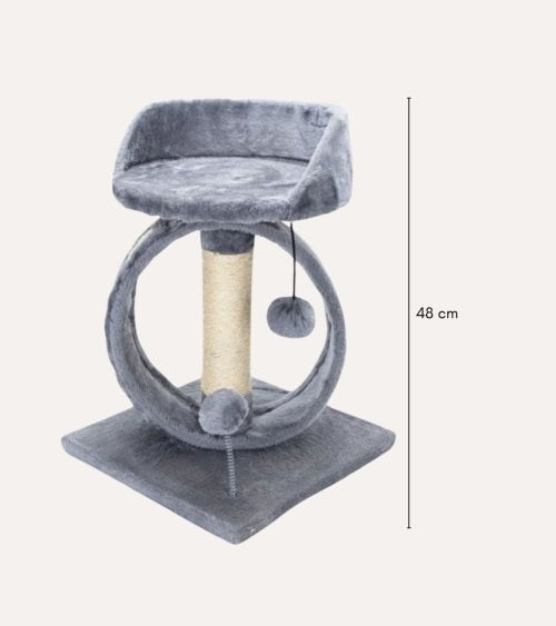 El Árbol Rascador para Gatos Circle Gris ofrece un área de descanso acolchada en la parte superior, ideal para el descanso y la observación de tu gato. Su diseño circular con peluches colgantes promueve el juego y la escalada, estimulando la curiosidad y el ejercicio. Fabricado con sisal duradero y telas amigables para las mascotas, este rascador de tamaño 34 x 34 x 48 cm es fácil de limpiar gracias a sus materiales lavables. Su color gris claro aporta un toque moderno y versátil, integrándose perfectamente en cualquier decoración del hogar.