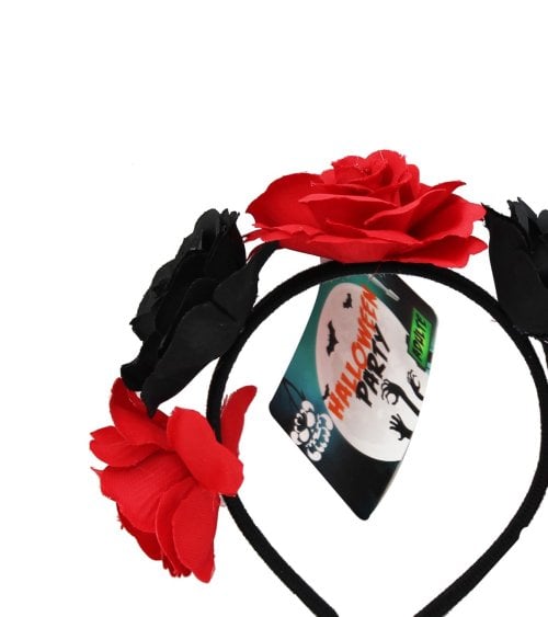 Esta diadema de flores para Halloween, con medidas para adultos de 18 x 18.5 x 7.5 cm, es el complemento perfecto para tu disfraz de Catrina. Con flores rojas y negras, aporta un toque de elegancia y misterio a tu look. Ideal para destacar en cualquier fiesta de Halloween.