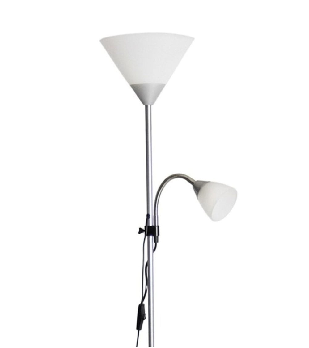 Lámpara de pie fabricada en metal con dos tulipas de plástico. Contiene un brazo articulable y ajustable en altura con doble interruptor para poder encender la luz individualmente.