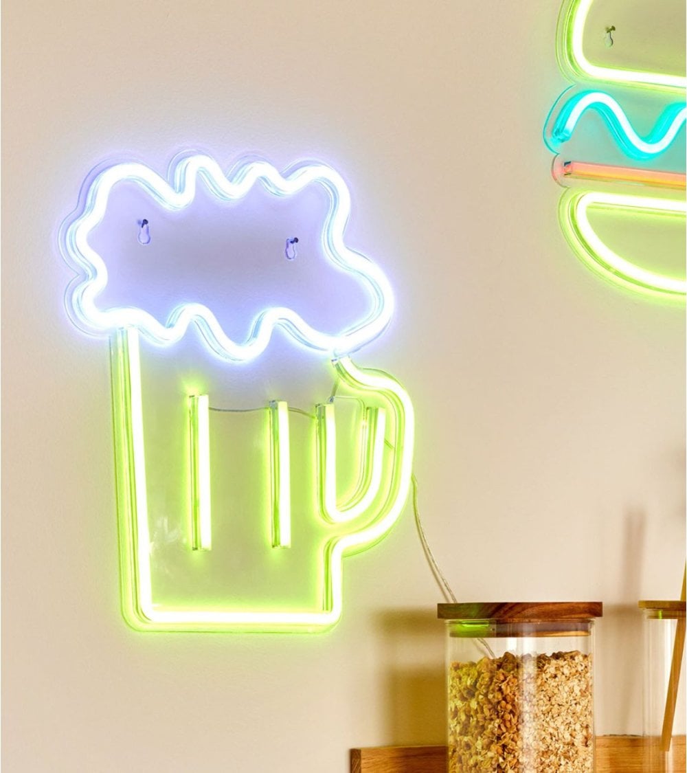 Con su contorno luminoso en tonos amarillos y blancos, este letrero LED de cerveza destaca tanto encendido como apagado, funcionando como elemento decorativo incluso durante el día. Es ligero, fácil de instalar y perfecto para dormitorios juveniles, cocinas con estilo industrial, salones temáticos o negocios de hostelería que quieran reforzar una estética desenfadada y atractiva. La tecnología LED garantiza una luz uniforme, brillante y duradera, a la vez que respeta el consumo energético.