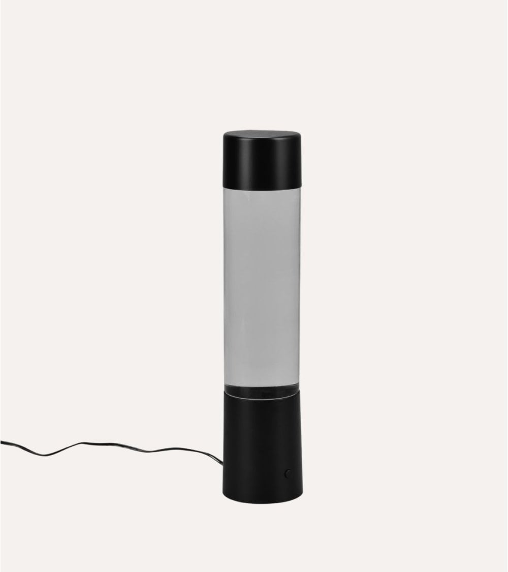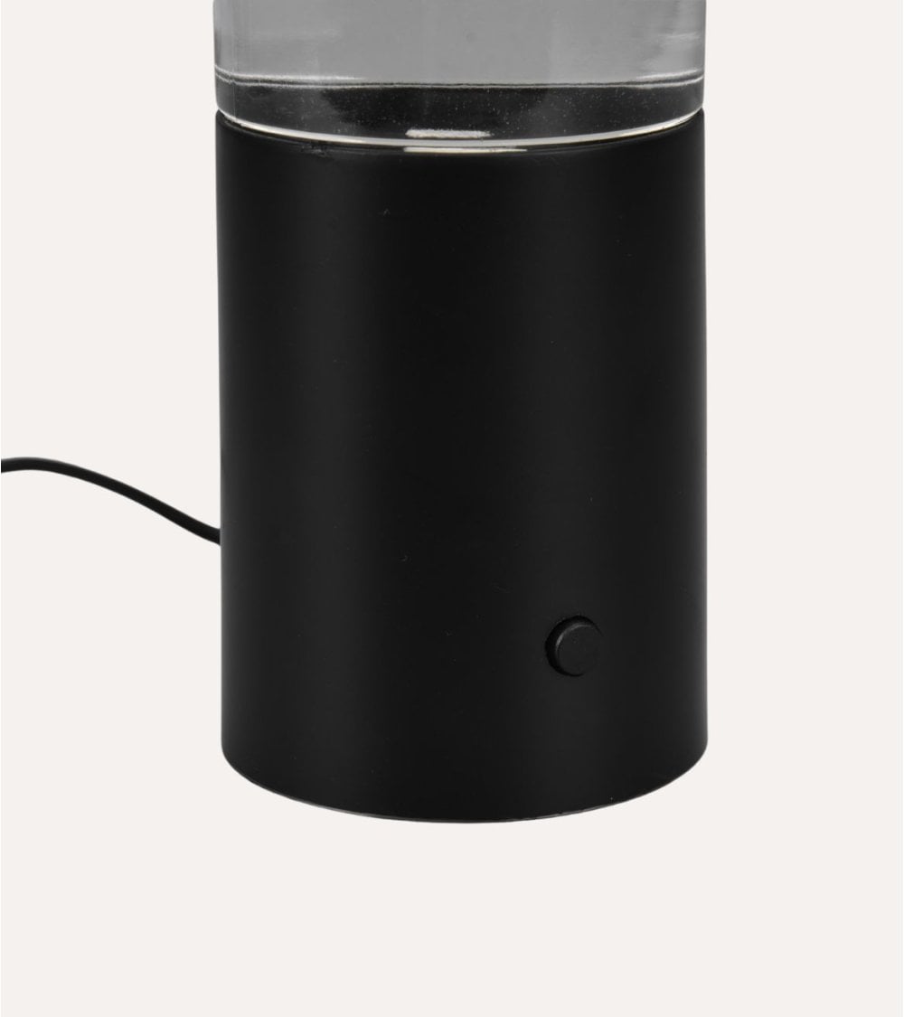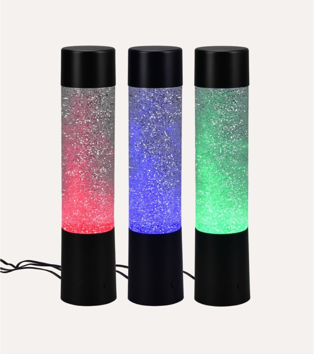 Su diseño cilíndrico, ligeramente cónico hacia la base, mide 7.5 x 7.5 x 34 cm, lo que la hace perfecta para colocar sobre escritorios, mesas auxiliares o mesitas de noche sin ocupar mucho espacio. La parte superior está fabricada en plástico transparente que contiene un líquido especial con partículas brillantes suspendidas, creando un efecto visual dinámico cuando se ilumina.