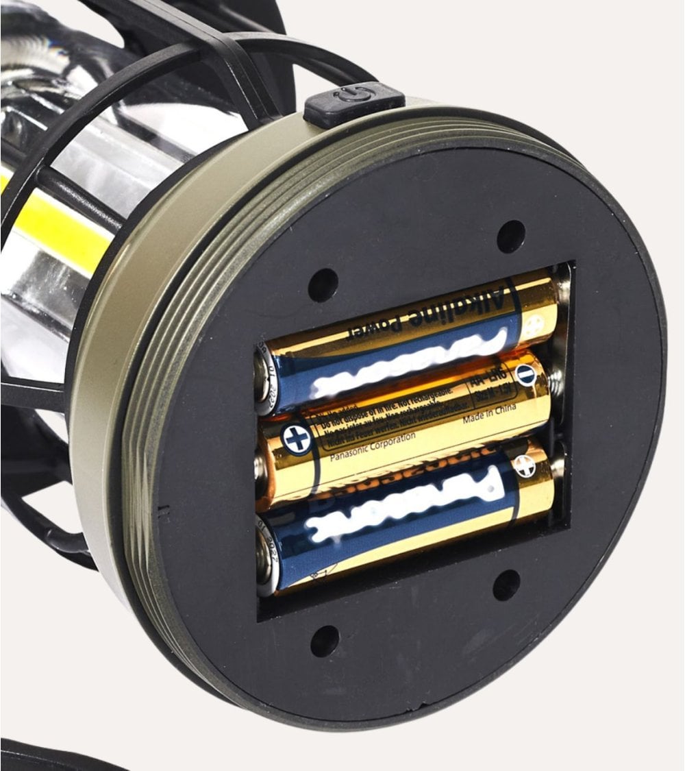 La lámpara cuenta con una estructura cilíndrica rematada por una cubierta tipo cúpula que protege su fuente de luz LED eficiente y duradera. Además, incorpora una rejilla metálica negra que no solo protege el lente transparente sino que también realza su estética tradicional. En la parte superior dispone de un gancho metálico curvado para colgarla fácilmente en ramas, tiendas o ganchos.