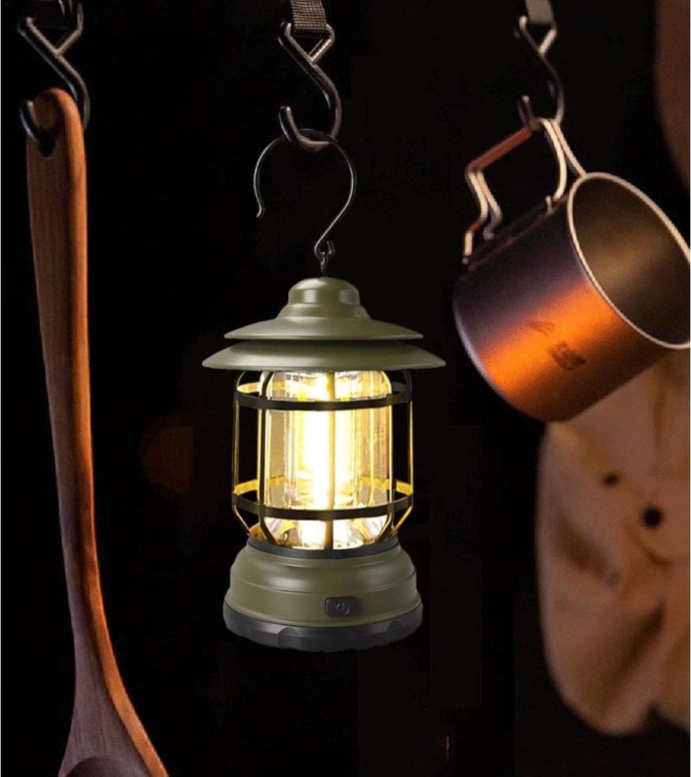 Con un diseño compacto y portátil, esta lámpara es ideal para camping, senderismo o simplemente para iluminar tu jardín o terraza durante las noches. Su acabado en color verde oliva le da un toque natural que se integra perfectamente con el entorno exterior, mientras que los detalles en negro aportan un contraste elegante y resistente.