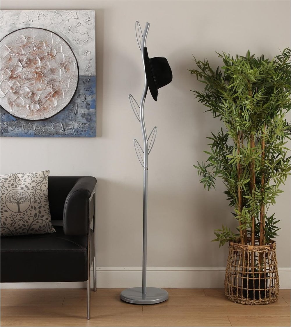 Perchero de pie de estilo contemporáneo con cinco ganchos en forma de hoja y fabricado en metal.