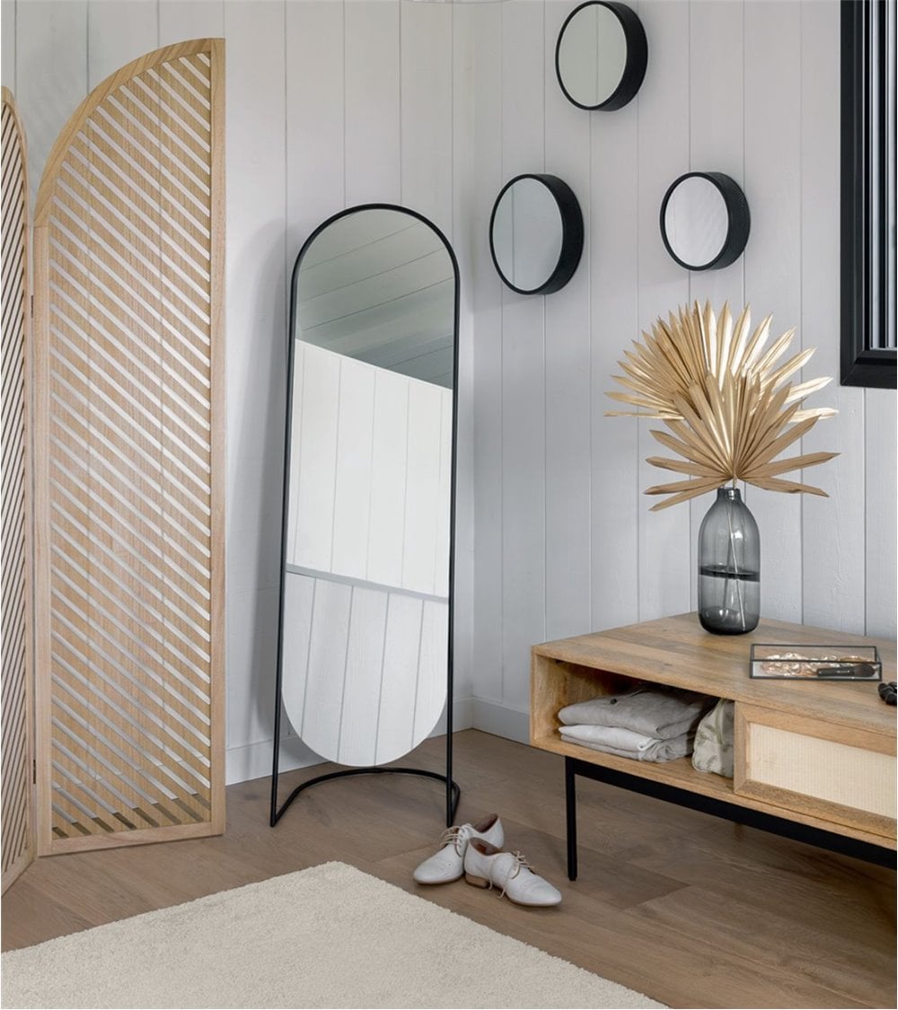 Espejo de pie en hierro negro, perfecto para hogares con elegancia.