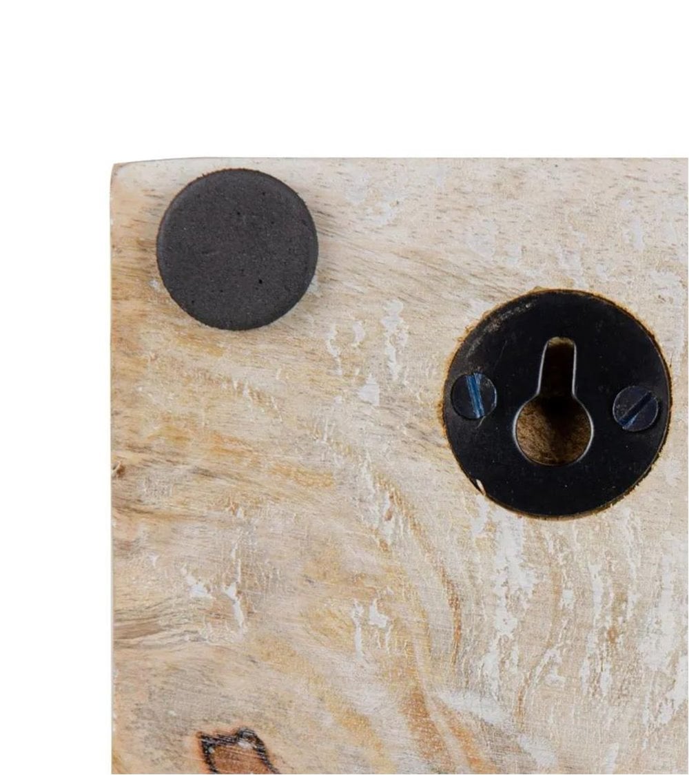 Perchero de pared fabricado en madera de mango con cuatro colgadores metálicos.