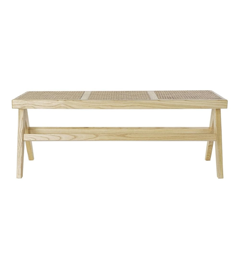 Descalzadora en forma de banco rectangular fabricada en madera de olmo y ratán. Disponible en color natural.