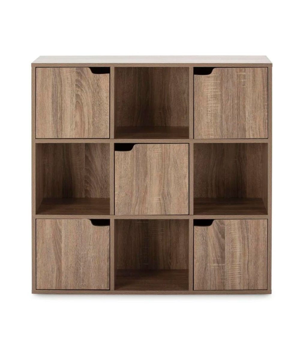 Mueble estantería de estilo nórdico con gran capacidad de almacenaje gracias a sus 9 módulos. Disponible en color roble.