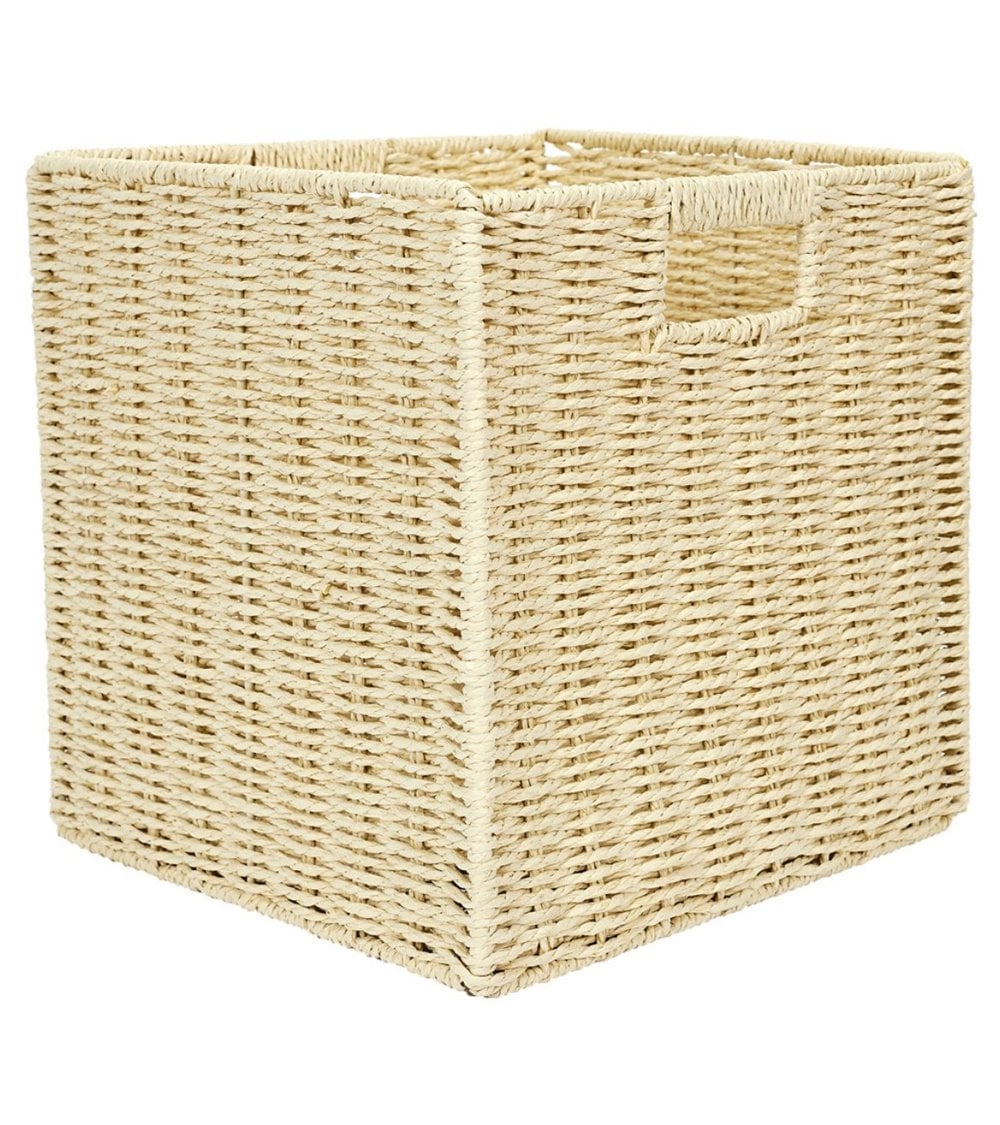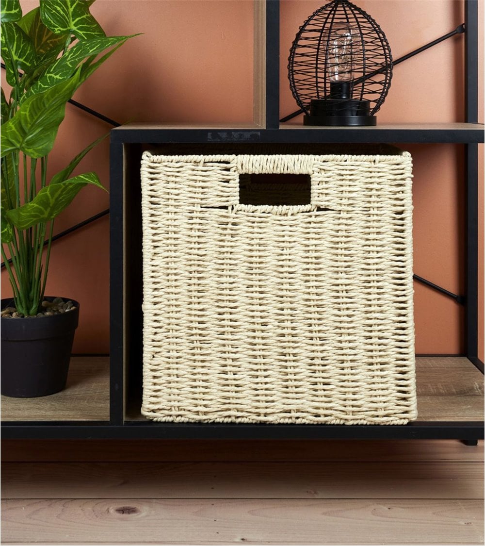 Cesta cuadrada perfecta para colocar en estanterías, ayuda a decorar y facilita el orden en tu hogar. Fabricada en fibra natural trenzada en color blanco roto.