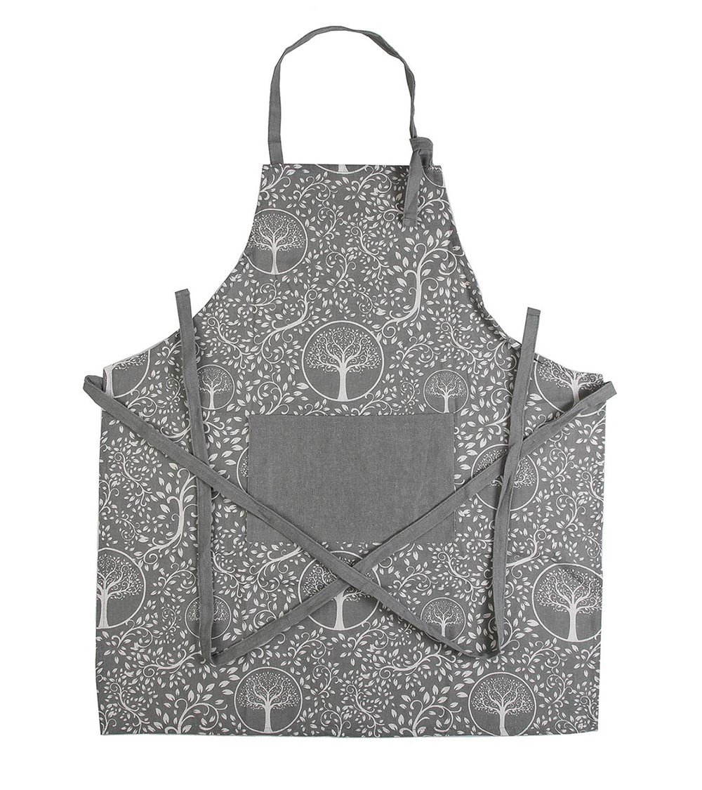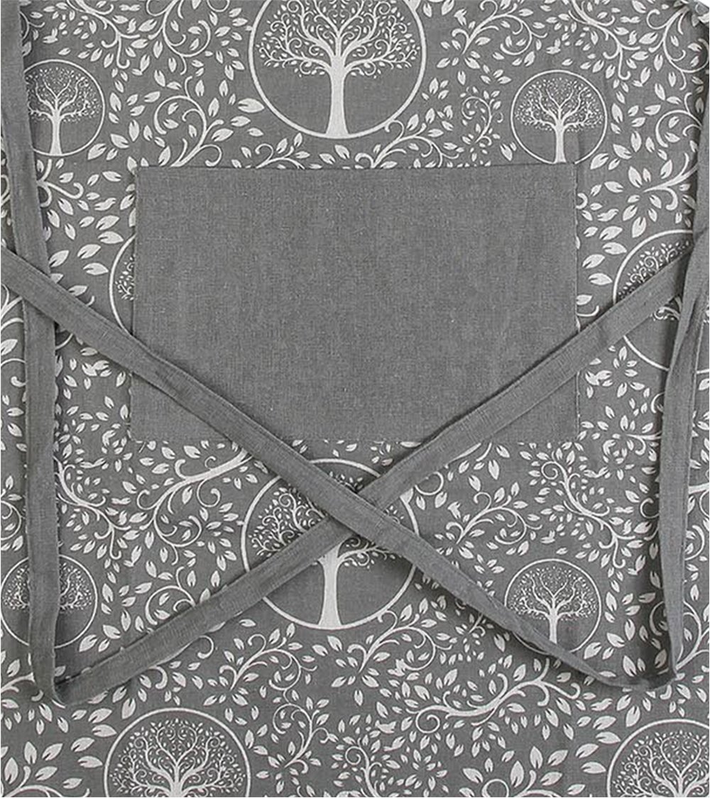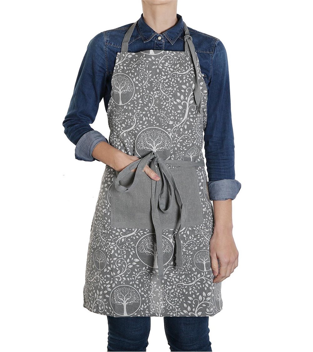 Delantal de cocina con bolsillo frontal confeccionado en poliéster (55%), algodón (35%) y nylon (10%), con un delicado entramado de hojas y árboles de la vida.