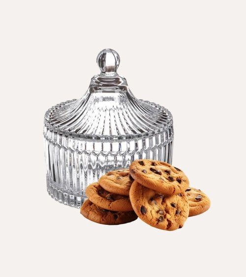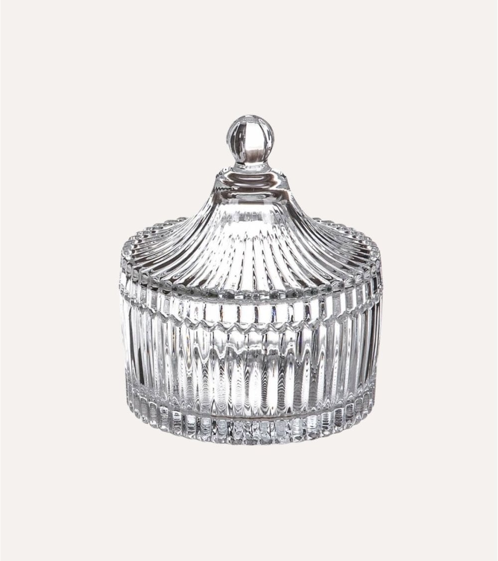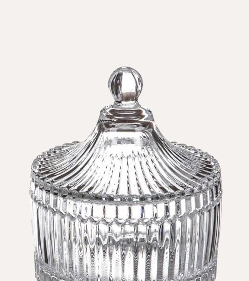 Elaborada en cristal transparente, esta bombonera ofrece una claridad excepcional que permite exhibir su contenido con un brillo único. Su superficie está adornada con patrones tallados que aportan textura y profundidad visual, creando un efecto luminoso que realza cualquier ambiente.