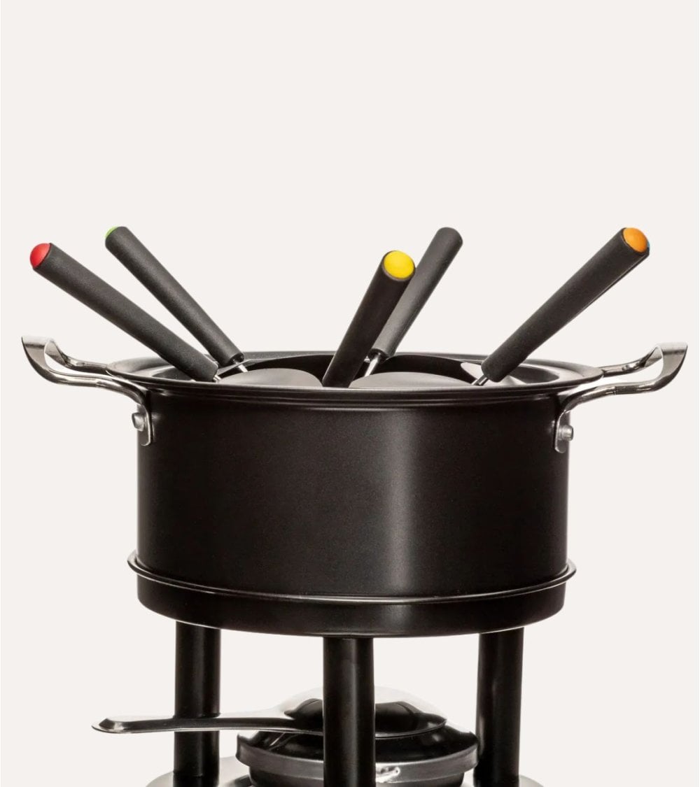 Cada set incluye seis tenedores de fondue con puntas codificadas por colores (rojo, verde, amarillo, naranja y dos negros), permitiendo que cada comensal identifique fácilmente su utensilio. Además, el soporte metálico proporciona estabilidad mientras disfrutas del calor constante gracias a su base calefactora.