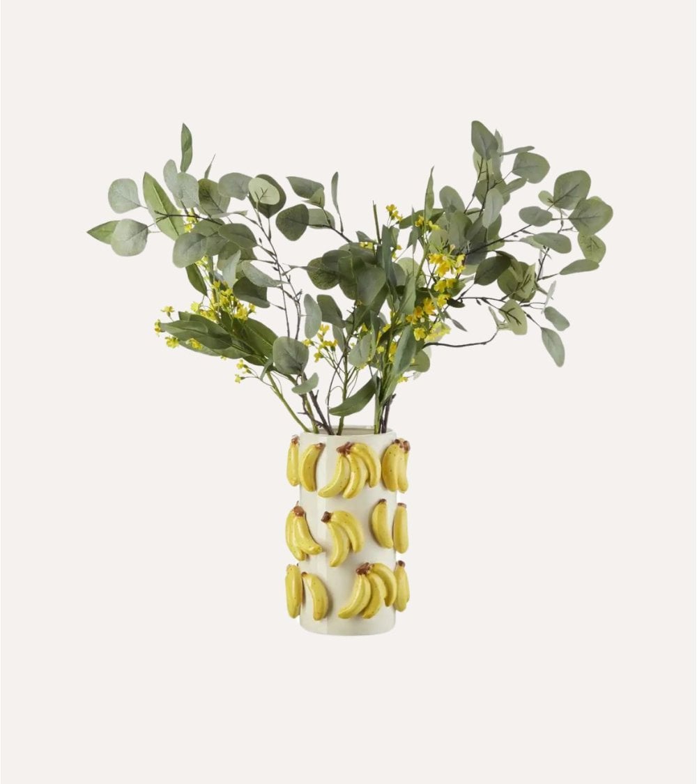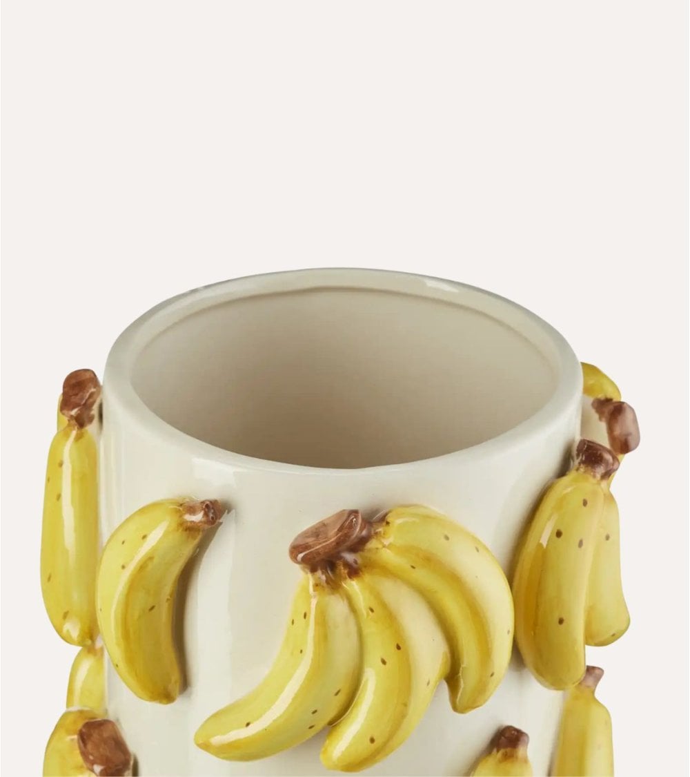 Fabricado en cerámica de alta calidad, este jarrón destaca por su acabado brillante que no solo realza su belleza sino que también garantiza durabilidad. La base en un tono crema suave crea un contraste perfecto con los detalles tridimensionales en forma de plátanos, pintados en un vibrante amarillo con puntas marrones que aportan dinamismo y originalidad a la pieza.