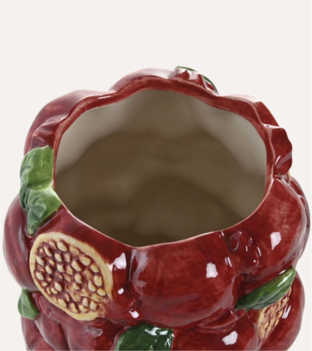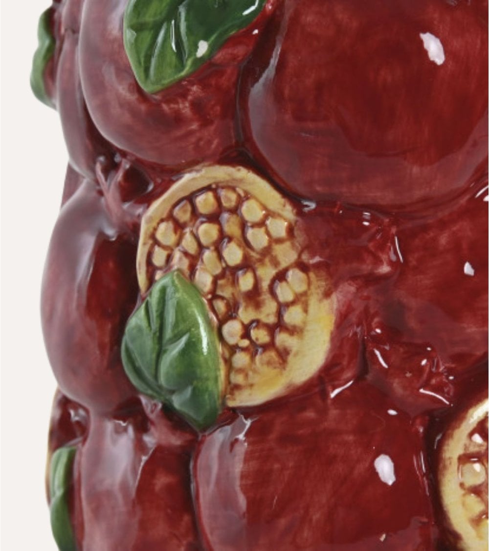 Su color principal es un intenso rojo granate, inspirado en la fruta del granado, complementado con delicados toques verdes que representan las hojas, aportando un contraste natural y elegante. La superficie del jarrón está adornada con un diseño texturizado que imita tanto granadas enteras como secciones cortadas, mostrando las semillas con un efecto visual muy realista gracias a su acabado esmaltado.