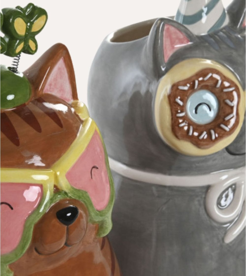 Fabricado en cerámica con un acabado brillante, este jarrón ofrece una textura suave y resistente que garantiza durabilidad y estilo. Su diseño capta la atención gracias a los detalles cuidadosamente elaborados: desde las gafas coloridas hasta los accesorios temáticos como sombreros y lazos, cada gato transmite alegría y creatividad.
