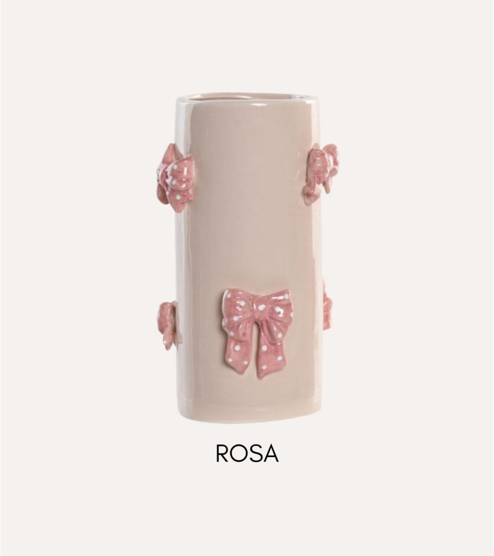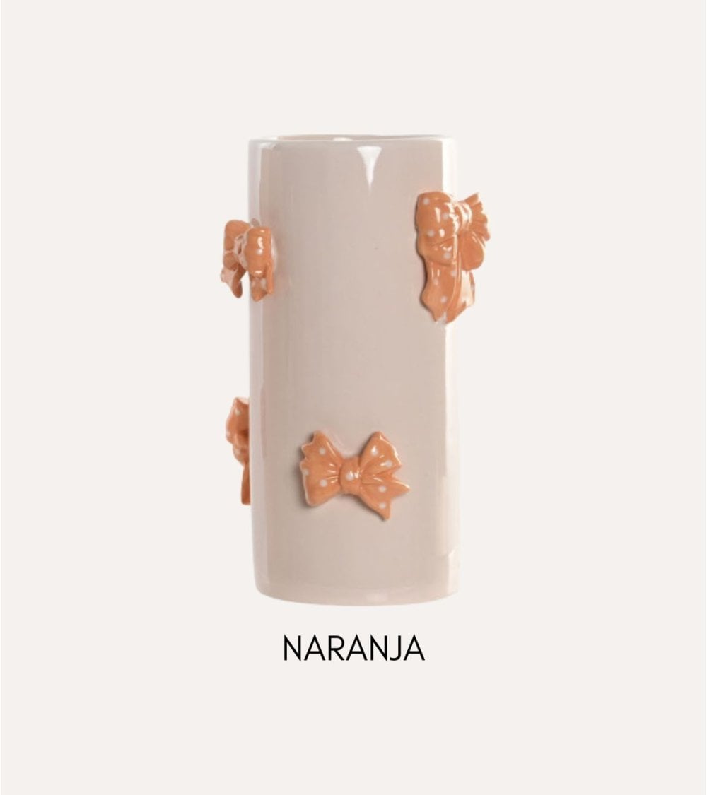 El cuerpo principal del jarrón está elaborado en un tono beige suave, que aporta neutralidad y calidez, permitiendo que los detalles decorativos resalten con gran protagonismo. Los lazos adheridos al jarrón están diseñados en tonos vibrantes como rosa o naranja, algunos con divertidos lunares, creando un contraste visual atractivo y lleno de vida. Además, estos lazos tienen una textura táctil que invita a ser tocada, añadiendo una dimensión extra a esta pieza decorativa.
