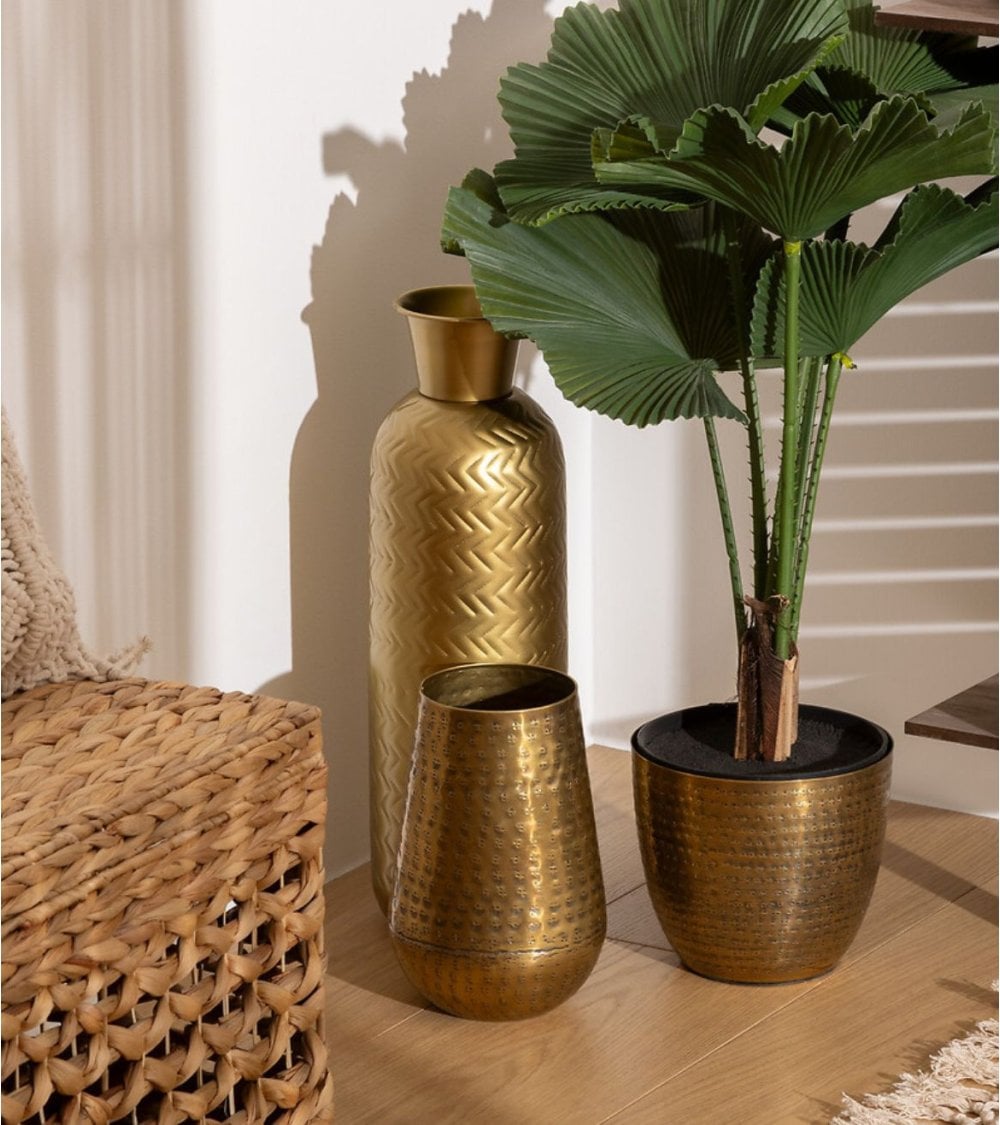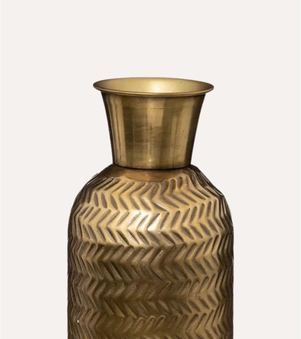 Fabricado en metal con acabado dorado, este jarrón ofrece una apariencia cálida y luminosa que se adapta perfectamente a estilos contemporáneos, bohemios o clásicos. Su superficie texturizada con un patrón de chevron o espiga grabado aporta profundidad visual y un juego de luces que realza su belleza desde cualquier ángulo.