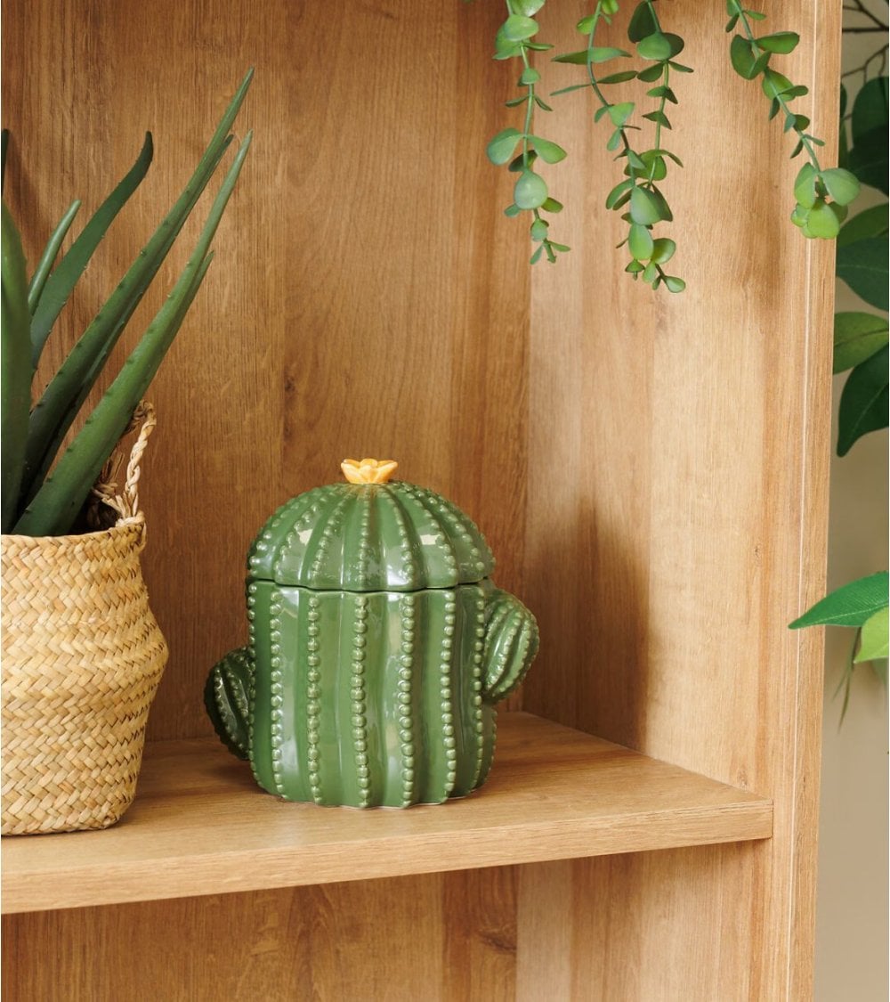 Esta pieza no solo es una opción decorativa, sino también funcional. Su tamaño compacto y forma bulbosa con base estrecha la hacen ideal para almacenar pequeños objetos como joyas, llaves o accesorios, manteniendo el orden sin sacrificar estilo. Además, su diseño incluye un brazo lateral que simula una rama del cáctus, aportando dinamismo y personalidad a la figura.