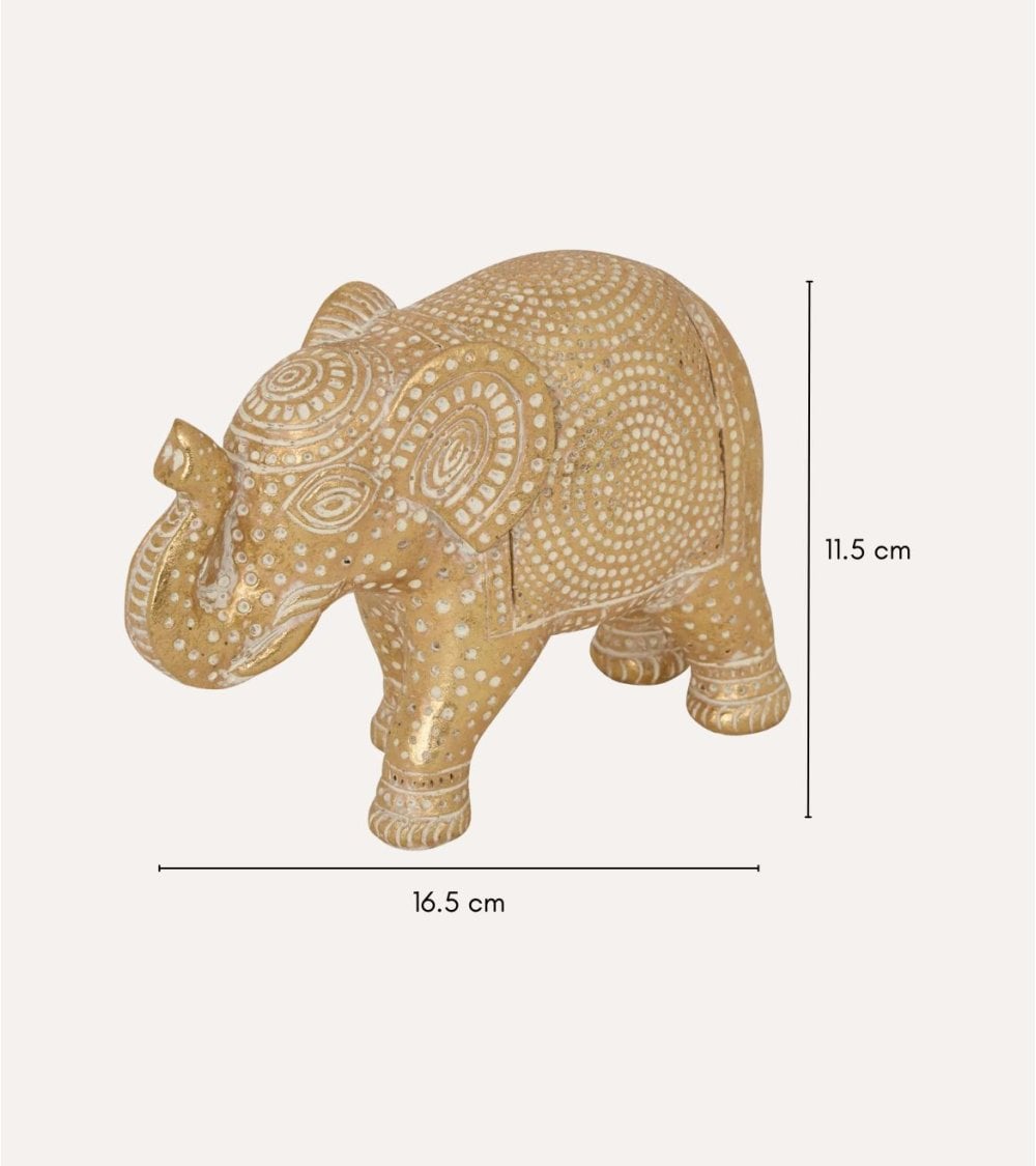 Con un acabado en tonos dorados cálidos, esta figura destaca por sus detalles meticulosos en blanco que evocan patrones tradicionales inspirados en el arte indio. Su diseño estilizado presenta un elefante con la trompa levantada, símbolo universal de buena suerte y prosperidad, perfecto para añadir un toque positivo a tu hogar u oficina.