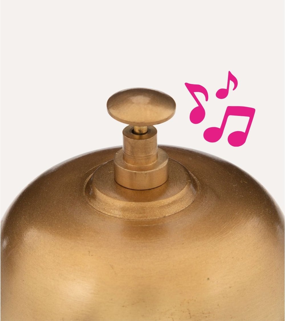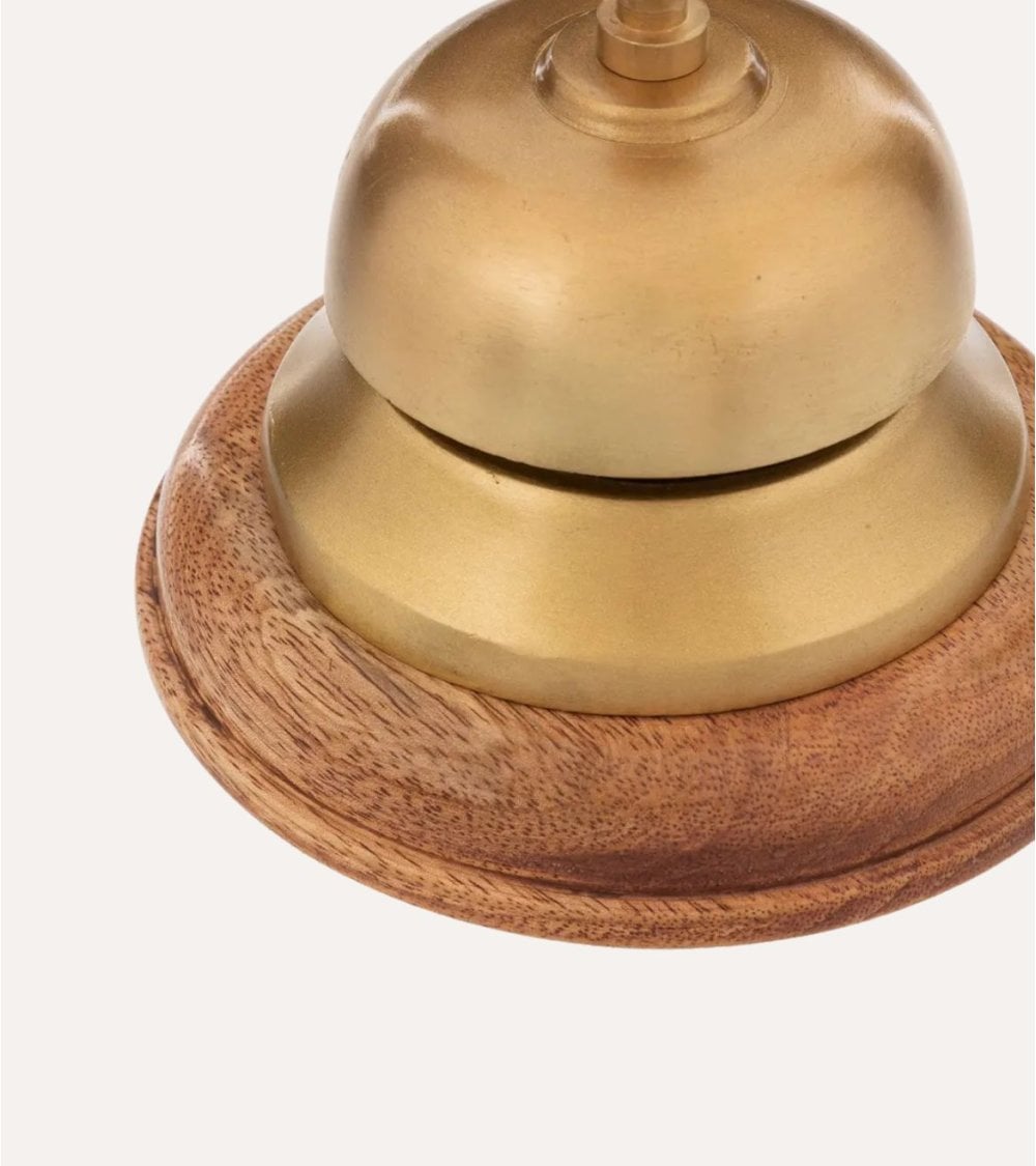 - Materiales: Metal pulido para el timbre y madera de mango natural para la base.