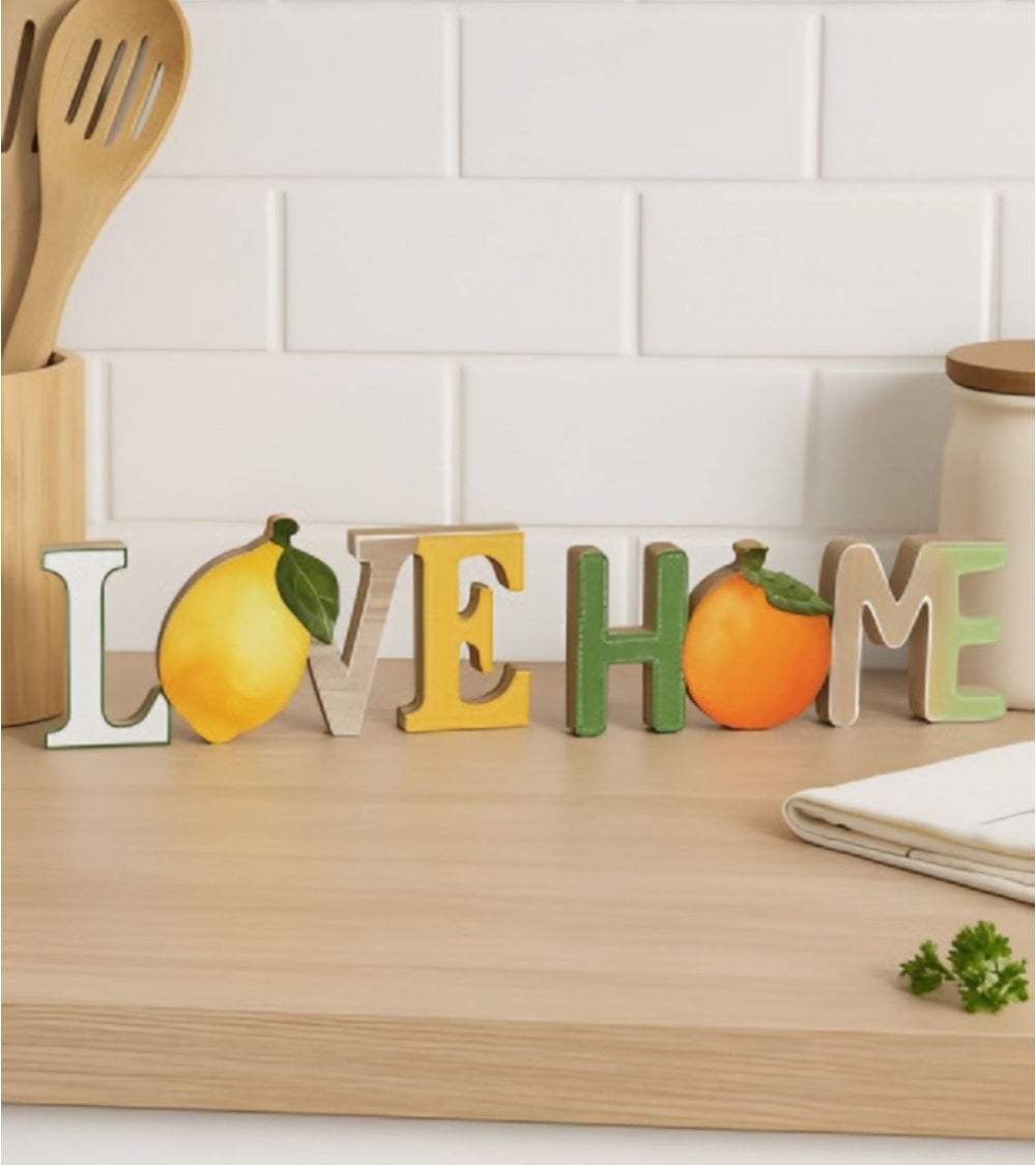 - Diseño: Letras individuales decoradas con frutas ilustradas (limón o naranja) para un toque fresco.