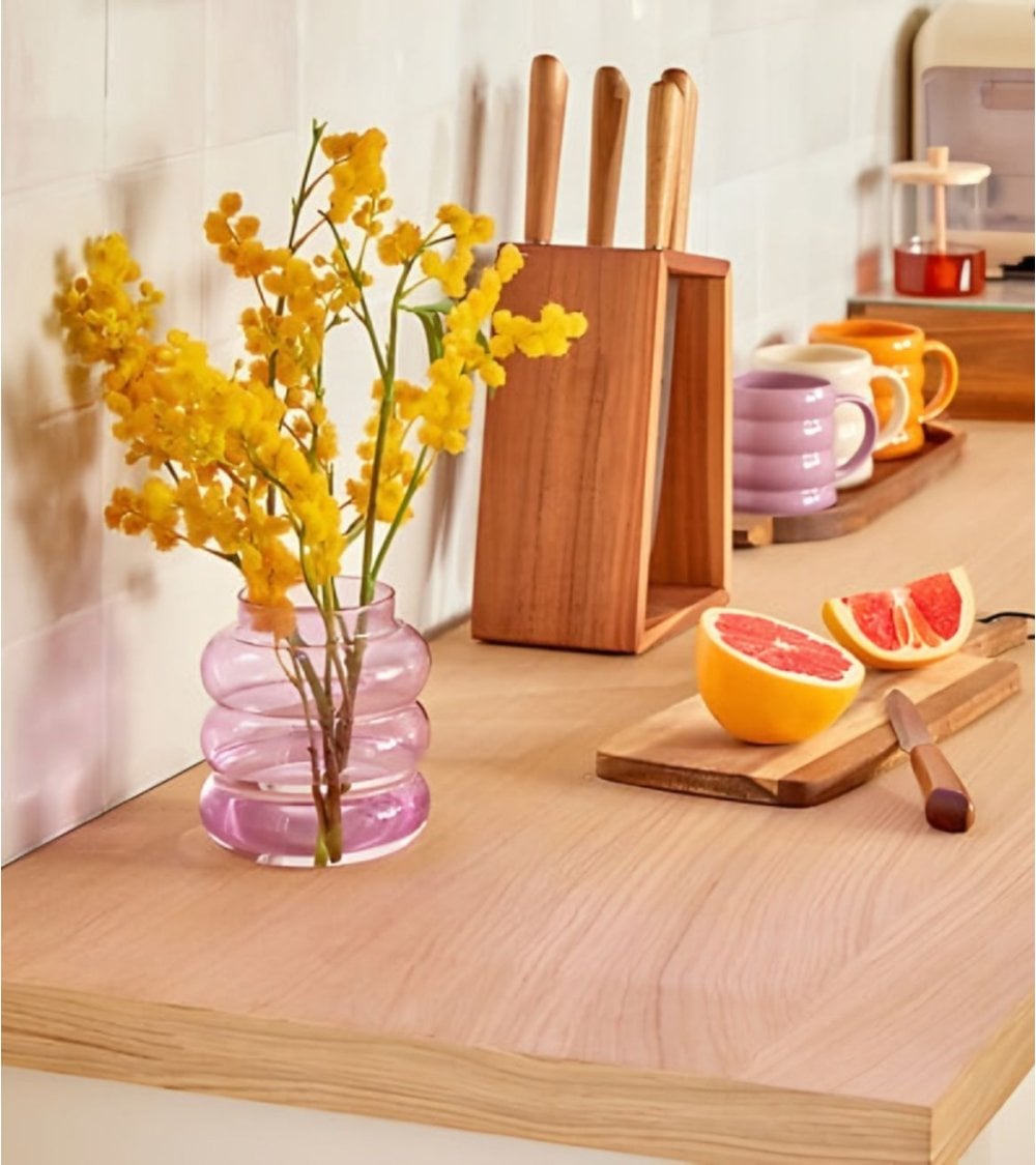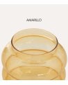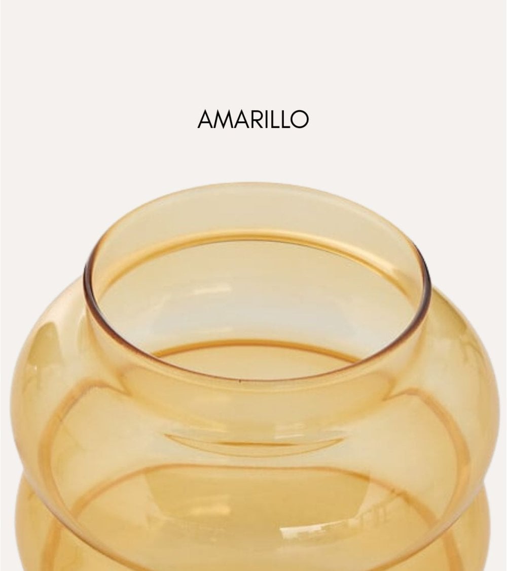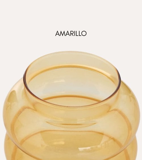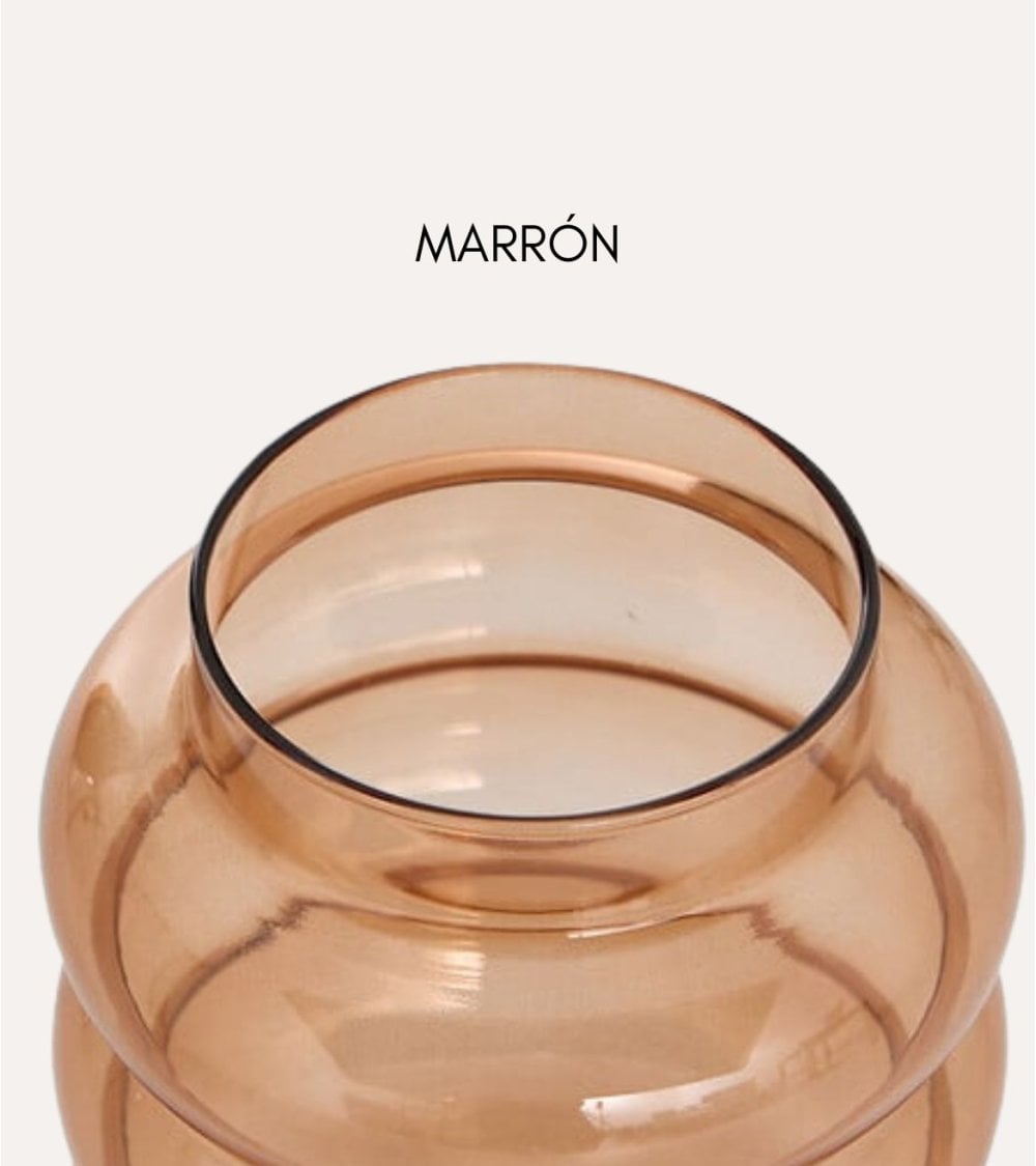 El Jarrón Unia Burbujas de Vidrio Tintado está fabricado íntegramente en vidrio de calidad, lo que garantiza una gran estabilidad visual y un aspecto ligero gracias a su translucidez. Las diferentes opciones de color permiten combinar varias unidades para crear composiciones equilibradas: el rosa añade dulzura, el blanco aporta pureza y luminosidad, el marrón brinda calidez natural y el amarillo introduce una nota alegre y decorativa ideal para revitalizar espacios neutros.