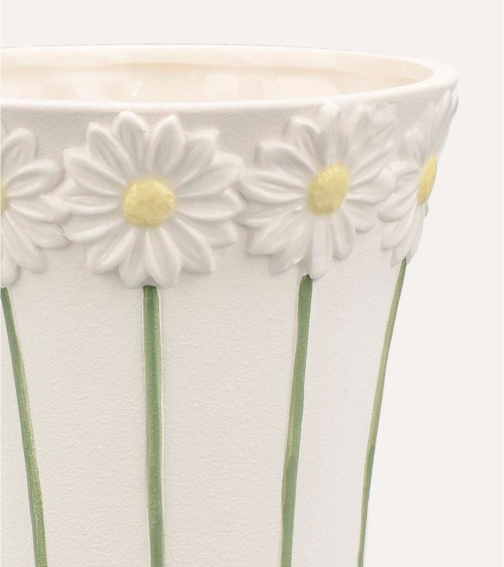 - Diseño cilíndrico con borde superior decorado con margaritas en relieve de acabado detallado.
