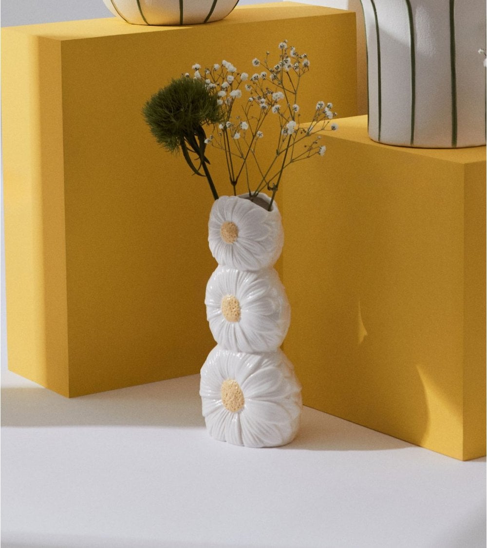 El Jarrón Florysia con Margaritas Apiladas de Gres de Bizzotto, es una pieza decorativa ideal para quienes buscan dar un toque fresco, floral y contemporáneo a su hogar. Su diseño reproduce una delicada pila de margaritas de pétalos blancos con centro amarillo, creando un efecto escultórico que transforma cualquier rincón en un espacio lleno de estilo.