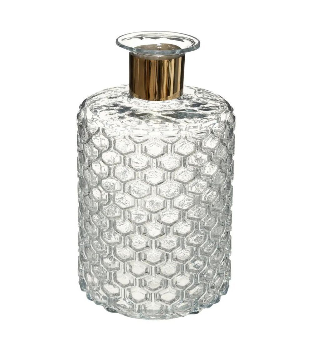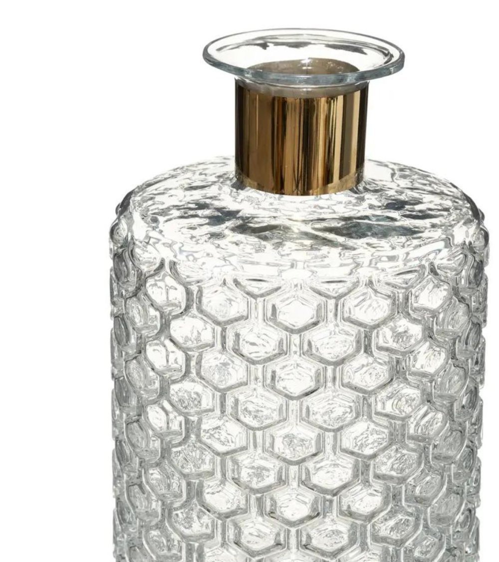 El Jarrón Suite de Cristal con Relieve Elegante es una pieza de decoración única que aportará un toque de sofisticación a cualquier espacio. Este jarrón, con su diseño en relieve de panal de abejas y una banda metálica en la boquilla, es una combinación perfecta de elegancia y modernidad. Su acabado de cristal brillante refleja la luz de manera espectacular, creando un ambiente cálido y acogedor.