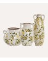 Este encantador Jarrón de Limones con Asas Estilo Vintage está disponible en 3 modelos con distintas medidas. El Modelo 1 mide 21 x 20 x 16 cm, el Modelo 2 tiene dimensiones de 17 x 17 x 22 cm y el Modelo 3 es de 13 x 13 x 35 cm. Cada jarrón presenta un patrón de limones pintados a mano, aportando un toque fresco y colorido. Sin embargo, el acabado antiguo y desgastado del jarrón le otorga un auténtico estilo vintage.