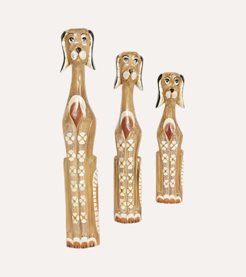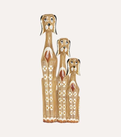 Esta figura decorativa de perro largo de madera es un encantador adorno tallado con un estilo estirado o alargado. Disponible en tres medidas diferentes para adaptarse a cualquier espacio de tu hogar. El tamaño pequeño mide 13 x 7 x 60 cm, el mediano 15 x 8 x 80 cm y el grande 28 x 22 x 102 cm. Este perrito de madera es el toque perfecto para añadir un poco de encanto a tu decoración.