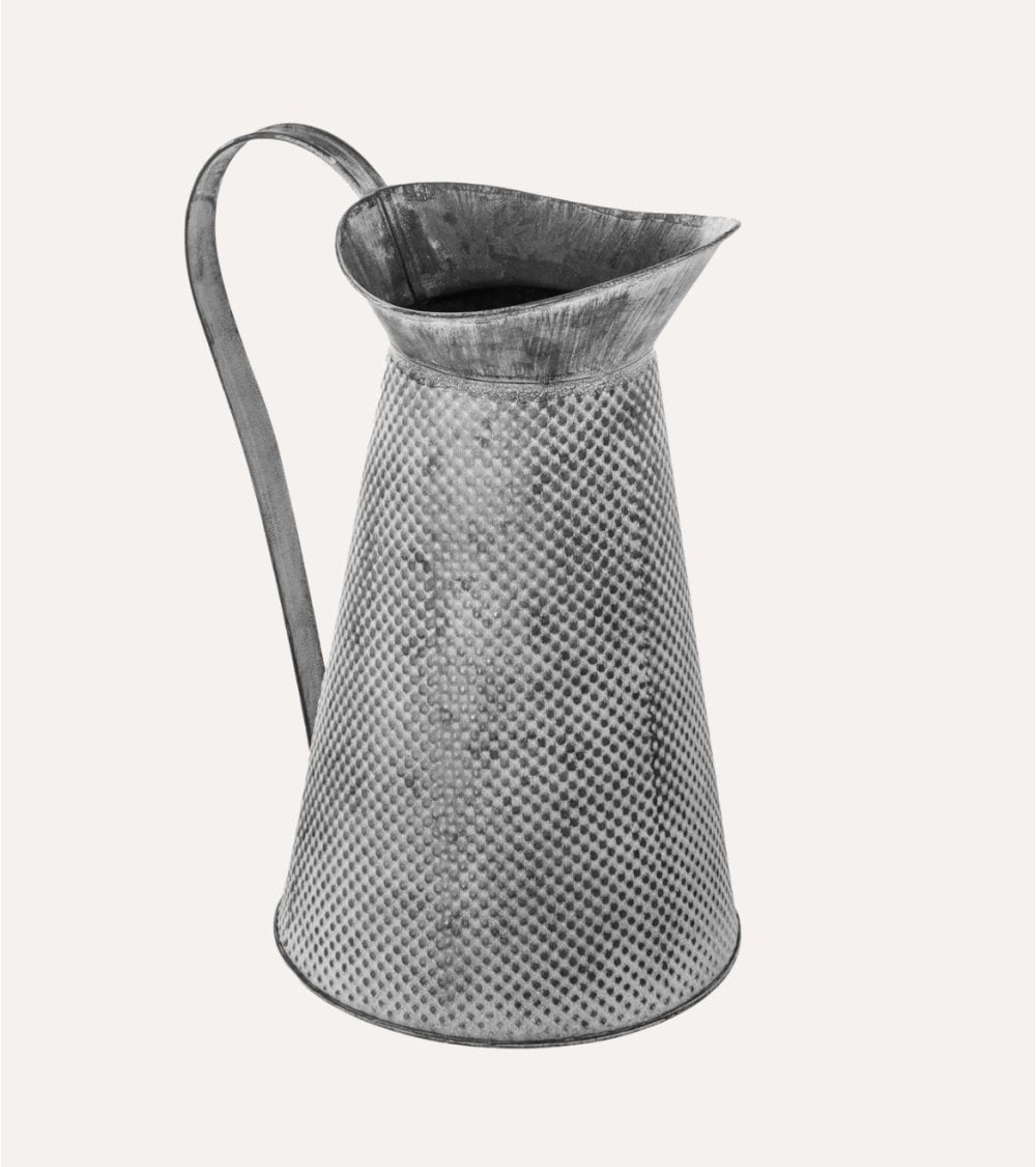 Con su diseño clásico, la jarra presenta una forma tapered, con una base amplia que se estrecha hacia el cuello, creando una silueta sofisticada. Su acabado en un tono gris apagado resalta la belleza del zinc, aportando un toque rústico e industrial a cualquier ambiente.