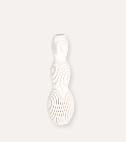 Con su forma de silhouette en hourglass, el jarrón se estrecha hacia el cuello, culminando en una tapa esférica que no solo añade un toque estético sino que también proporciona versatilidad. Su acabado puede recordar a un efecto helado, creando un juego de luces y sombras que captará la atención de todos.