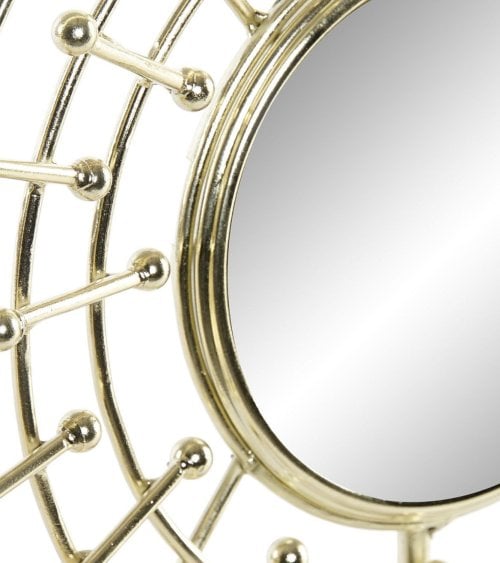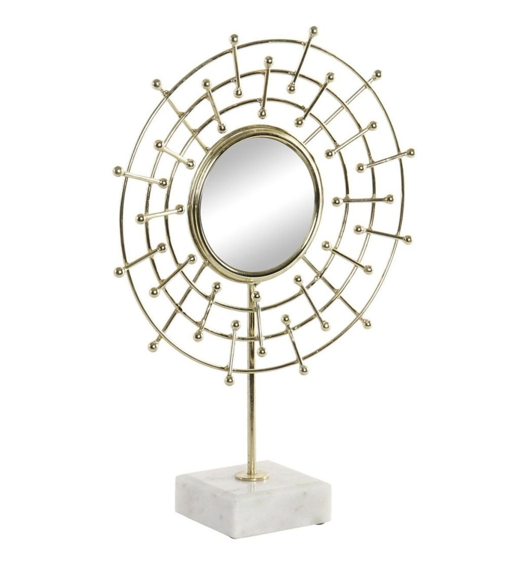 Este fantástico espejo de mesa presenta un impresionante diseño en el que cobra protagonismo el marco, en el que las líneas curvas de los círculos se ven atravesadas y delimitadas por pequeñas barras a lo largo de toda su longitud. Un producto ideal para colocar sobre un tocador o una cómoda, añadiendo un componente decorativo a la estancia. Además, su estructura junto con el pie en mármol lo convierten en un producto perfecto para crear un ambiente de estilo chic.