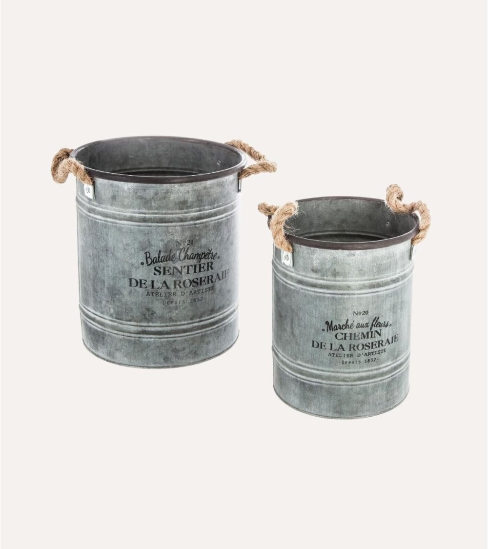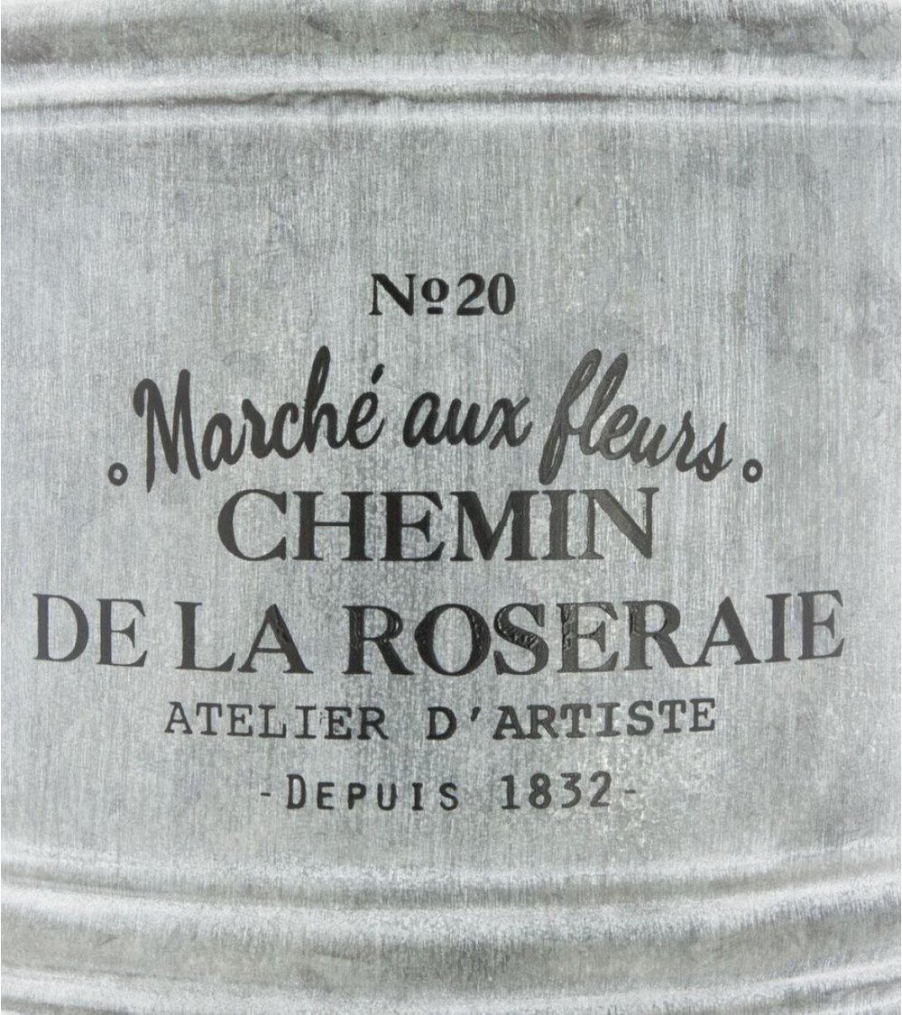 Este cubo decorativo de metal, con su textura vintage y envejecida, es una pieza única que añade un toque rústico a cualquier espacio. Disponible en dos tamaños, pequeño (18,5 x 22,3 cm) y grande (22,5 x 24,3 cm), es práctico y fácil de manejar gracias a sus resistentes asas de cuerda. El diseño artístico, adornado con texto decorativo que dice Marché aux fleurs Chemin de la Roseraie y Atelier d'artiste - depuis 1852, lo convierte en un elemento decorativo por sí solo. Además, su versatilidad permite utilizarlo como macetero o contenedor de almacenamiento. Ideal para estilos rústicos o farmhouse.