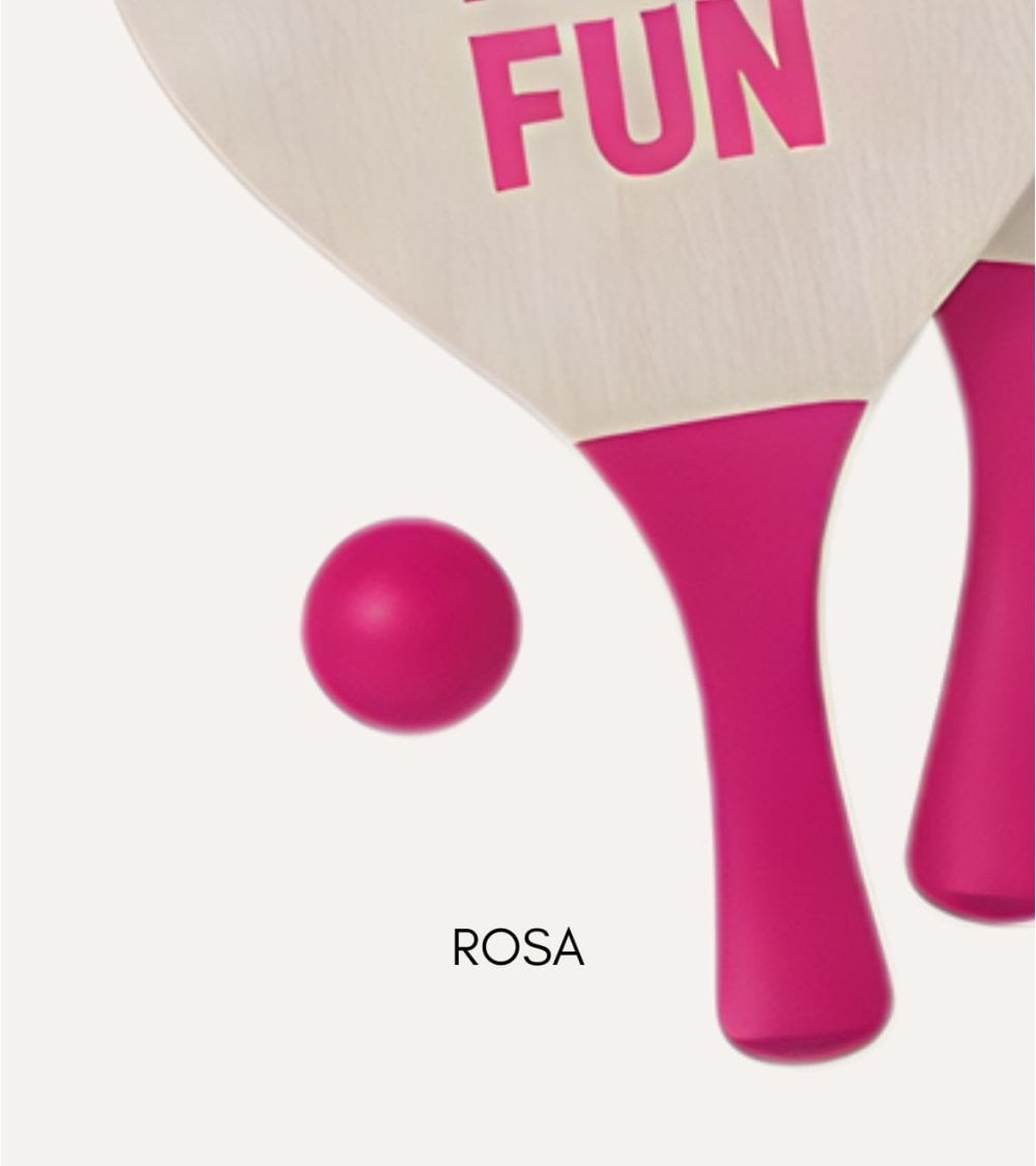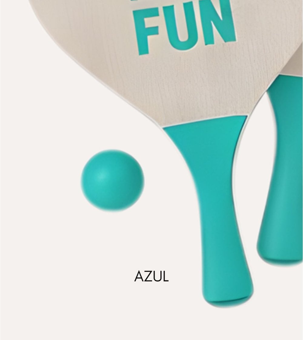 Cada pala presenta un acabado en madera clara con mensaje estampado LET’S HAVE FUN y palmeras decorativas, disponible en diferentes variaciones de color: mango rosa, verde o azul, todo combinado con pelotas a juego en tonos vivos como rosa y verde. Estas variaciones permiten elegir el estilo que mejor se adapta a cada miembro de la familia o diferenciar equipos durante el juego.