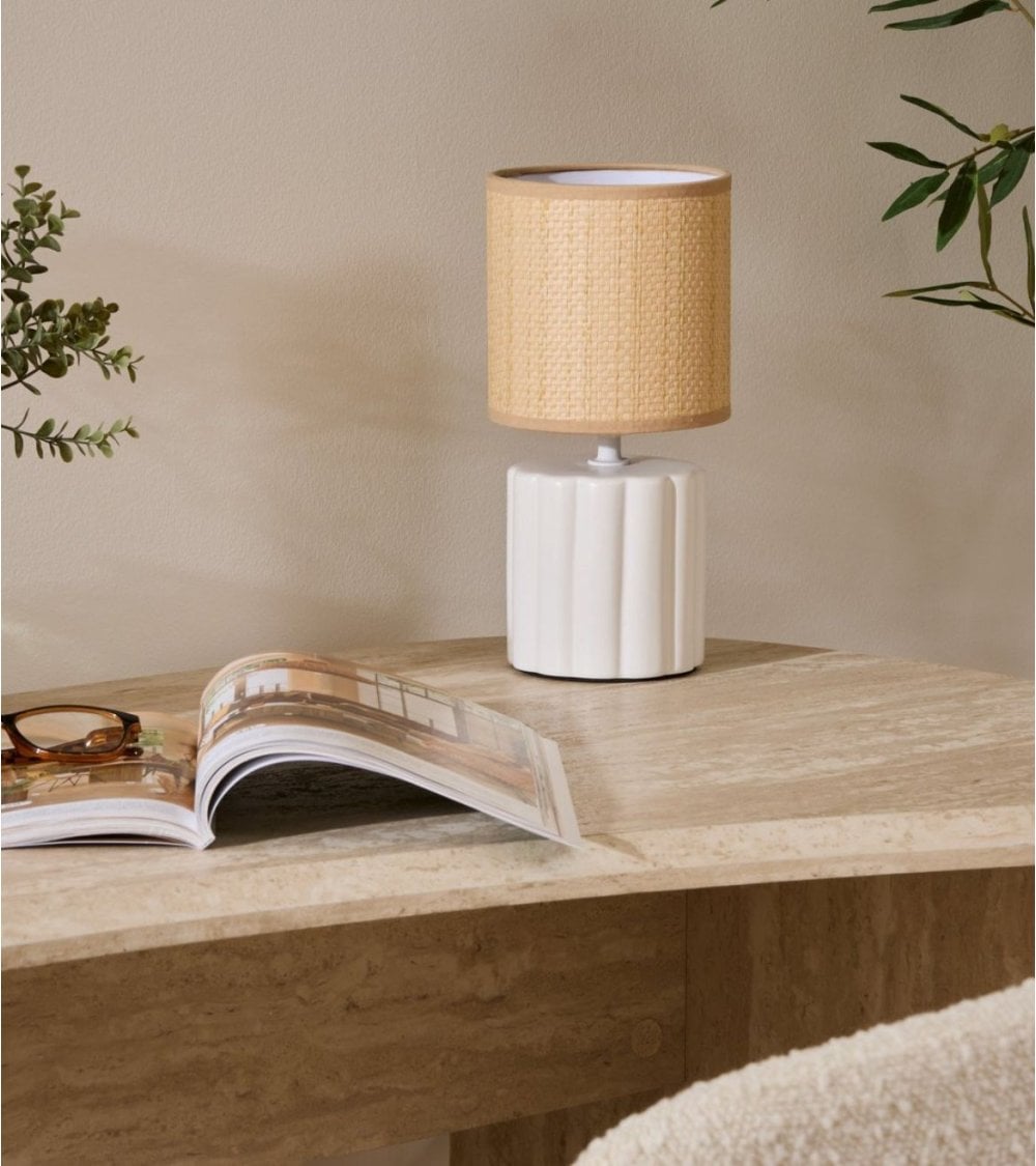 La lámpara Tylia es perfecta para espacios compactos como mesas de noche, escritorios o rincones pequeños del salón. Su combinación equilibrada entre el blanco frío de la base y el tono cálido del tejido hace que sea fácil integrarla en estilos variados, desde modernos hasta bohemios.