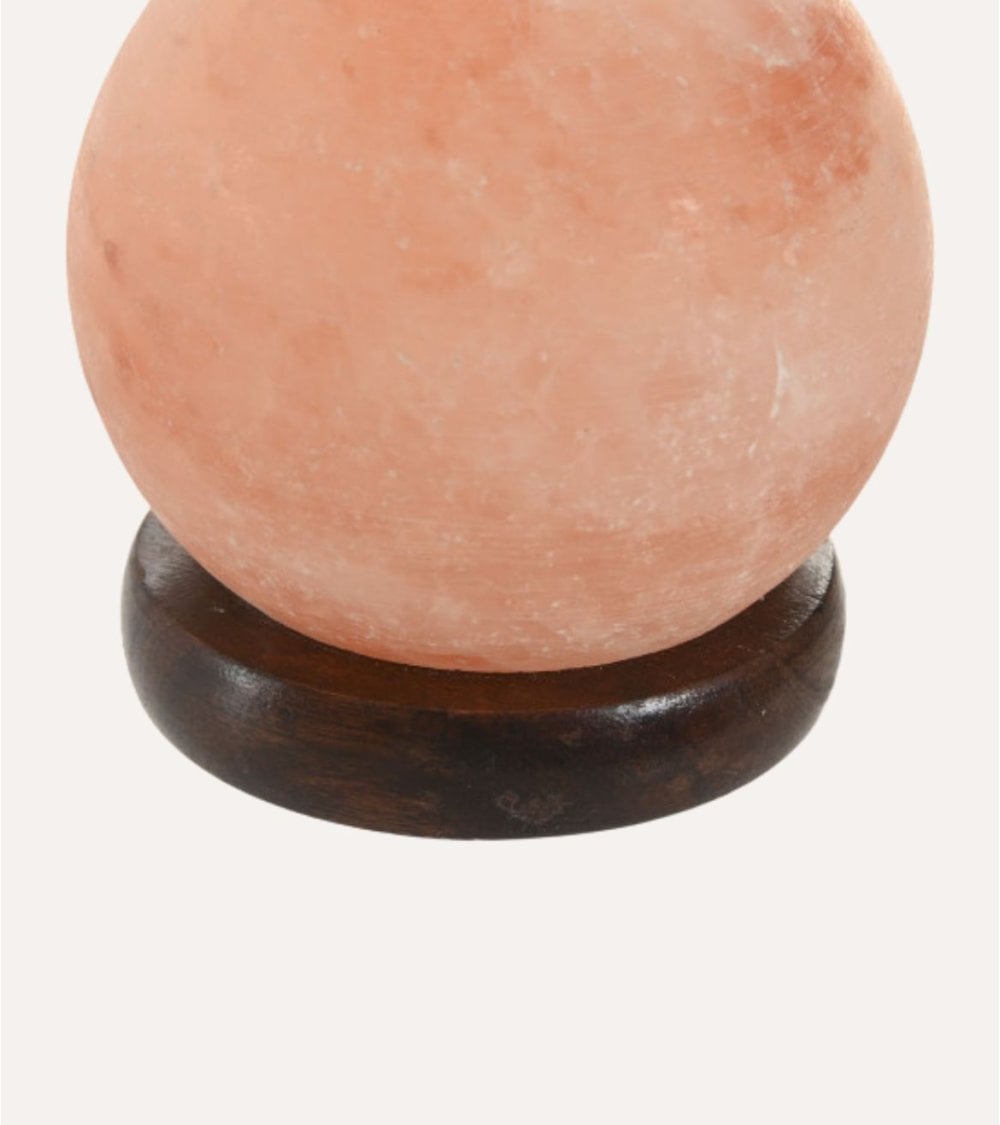 La esfera está elaborada con sal natural del Himalaya, reconocida por sus tonos rosados y anaranjados que varían sutilmente, ofreciendo un acabado translúcido y brillante. Su forma perfectamente esférica proporciona una estética armoniosa, mientras que su base circular en madera de acacia pulida añade estabilidad y un contraste visual atractivo.