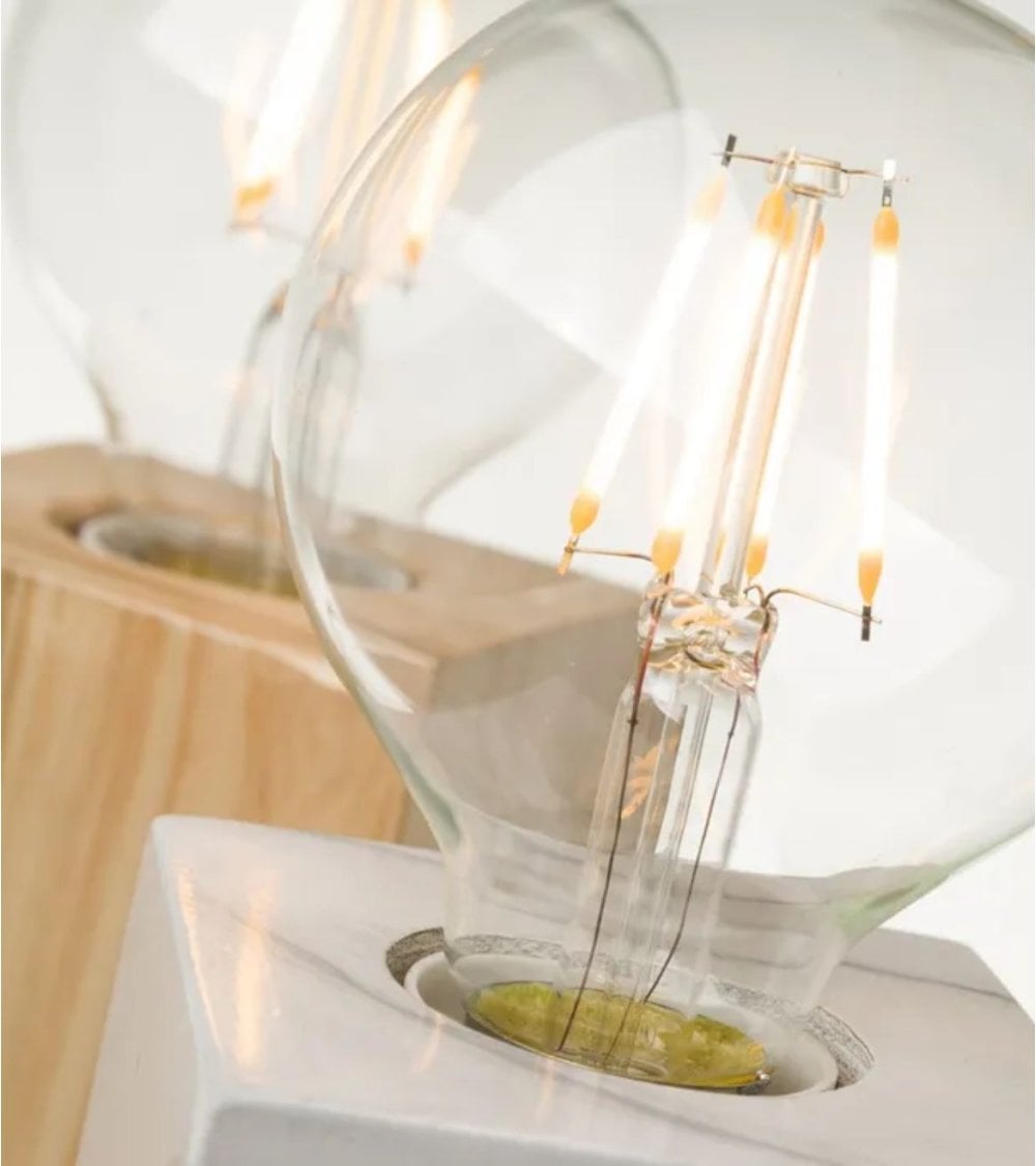 Lámpara de mesa con base de madera y bombilla de led con luz cálida. Disponible en diferentes modelos surtidos.