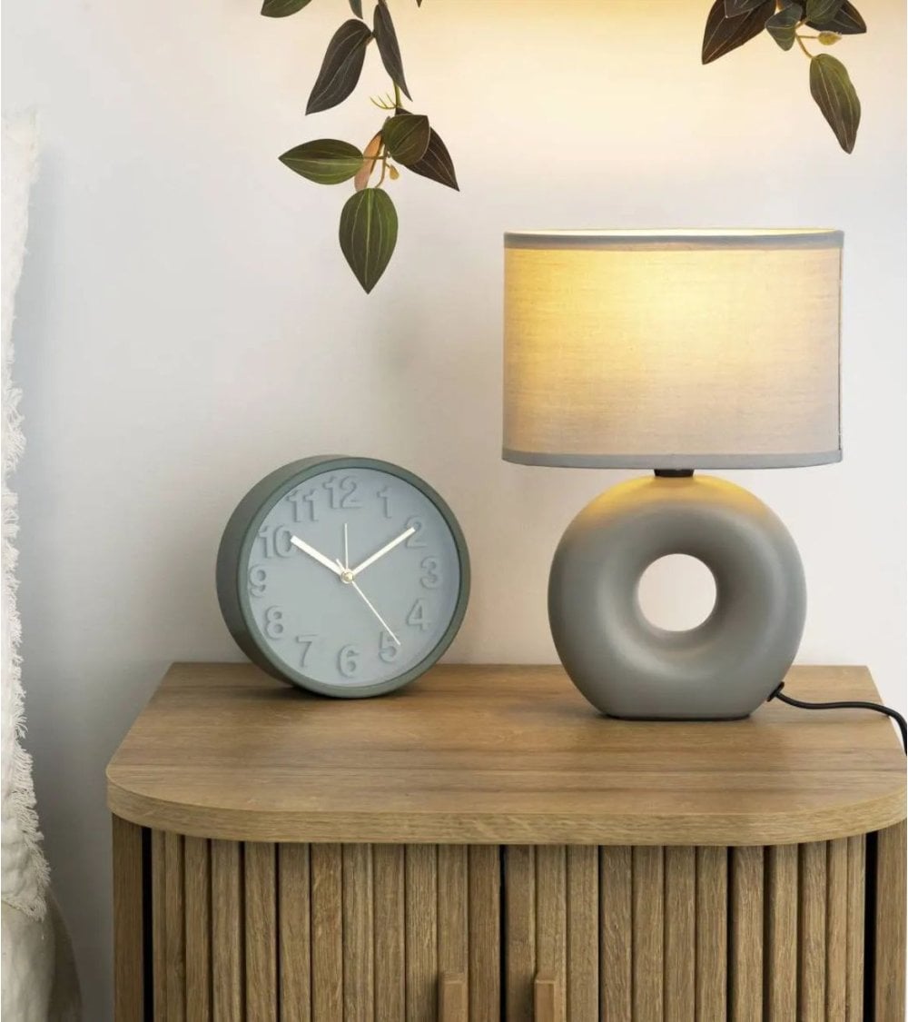 Disponible en dos colores versátiles, blanco y gris, esta lámpara se adapta fácilmente a diferentes ambientes, desde dormitorios hasta oficinas o salas de estar. Su base con forma circular tipo donut aporta un toque distintivo que combina perfectamente con la pantalla cilíndrica de tela, diseñada para difundir la luz suavemente y crear una atmósfera acogedora.