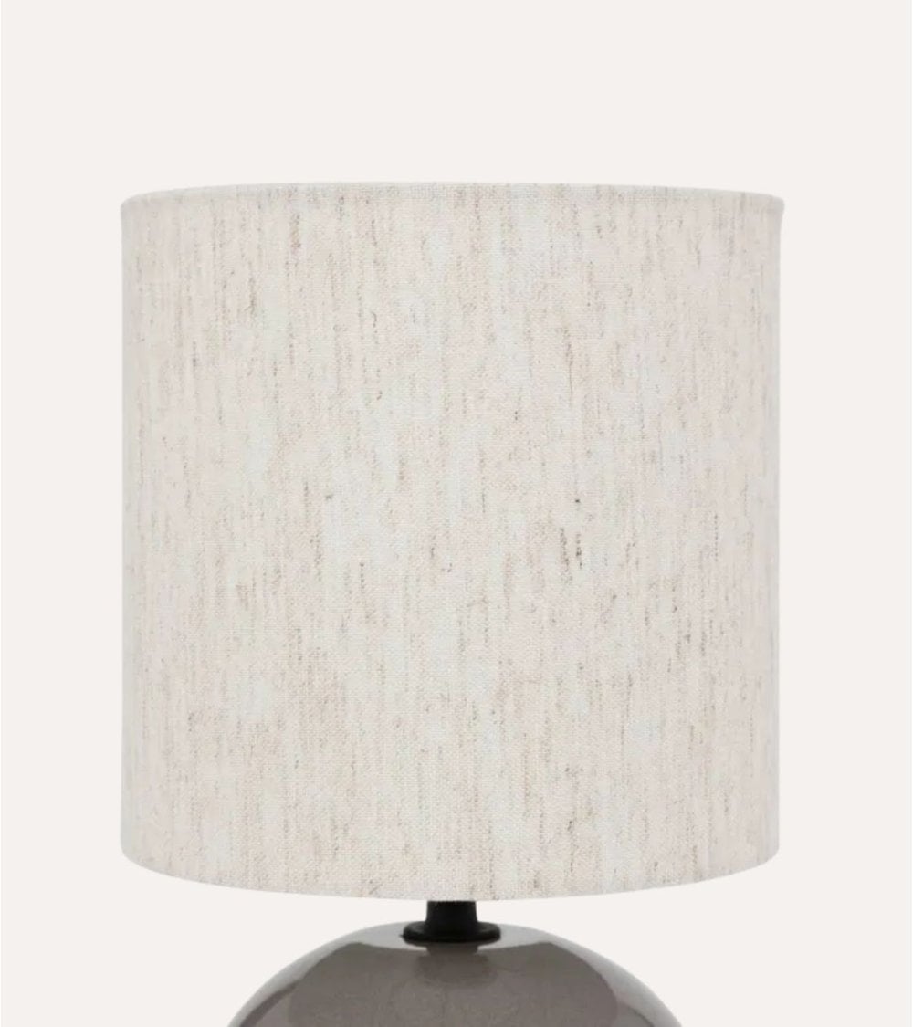 Disponible en tres colores sofisticados —Gris, Beige y Azul— esta lámpara es perfecta para complementar desde ambientes minimalistas hasta espacios más cálidos y acogedores. Su base esférica proporciona estabilidad mientras añade un detalle visual atractivo gracias a su acabado brillante y textura sutil. La pantalla cilíndrica, ligeramente cónica en la parte superior, está confeccionada en tela natural que difunde la luz suavemente, creando una atmósfera agradable.